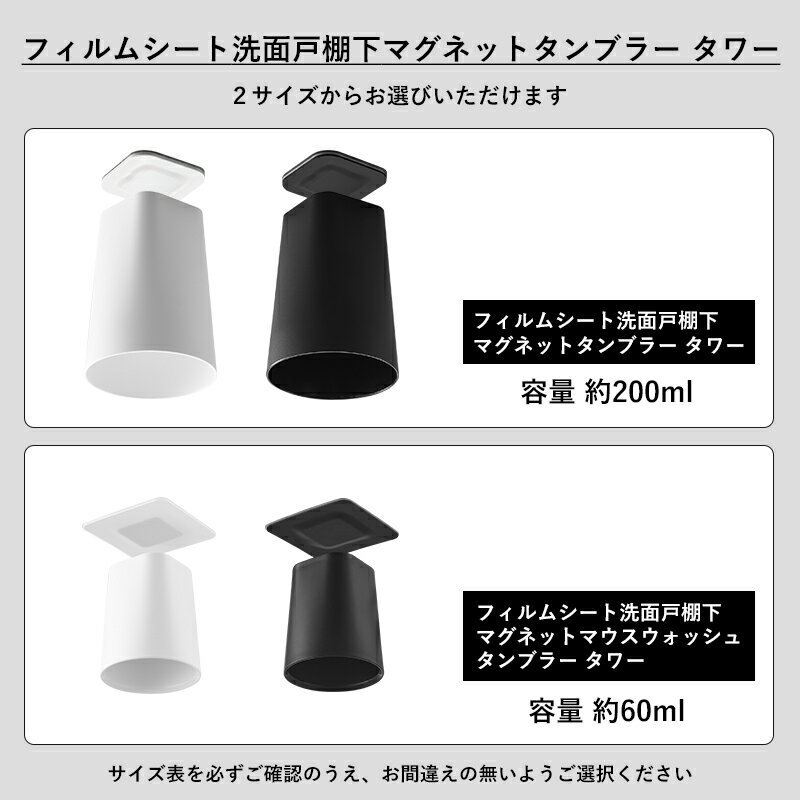 山崎実業 tower フィルムシート洗面戸棚下マグネットタンブラー/フィルムシート洗面戸棚下マグネットマウスウォッシュタンブラー タワー 1751 1752 10401 10402 はこんな商品です。 マグネットで浮かせて衛生的に収納できるタンブラー。 フィルムシートを吊り戸棚下などの光沢のある面に貼り付けるだけで準備完了! タンブラー底に内蔵されたマグネットを近づけると、ピタッと取り付けられます。 逆さまなので乾きやすく、浮かせることで洗面台のお掃除も簡単に。 お好みや使いたいシーンに合わせて2種類のサイズからお選びください。 ●北海道・沖縄・離島は追加送料がかかります。注文確認後、送料修正しご案内いたします。 この商品はラッピング可能です。(+110円)ご希望の方は[ラッピングする]を選択のうえ、ご注文ください。 JAN:4903208017510 JAN:4903208104012tower フィルムシート洗面戸棚下マグネットタンブラー/マウスウォッシュタンブラータワー サッと手に取れてサッと収納できるマグネットタンブラー。洗面所の吊り戸棚下に設置できるフィルムシートタイプです。 使い方はとっても簡単。フィルムシートを戸棚下などの光沢のある面に貼り付けて、マグネットの付いたタンブラー底をフィルムシートに近づけるだけ。ピタッとあっという間に収納完了です。 浮かせて収納できるから、タンブラーは素早く乾き衛生的。洗面台のお手入れもしやすくなります。 使いたいシーンやお好みに合わせて2種類のサイズからお選びいただけます。 フィルムシートのホールド部分にタンブラー底を近づけるとピタッと吸着。その秘密はタンブラー底に埋め込まれたマグネット。ワンアクションで手に取る・仕舞うが完結できる優れものです。 タンブラーを逆さにして収納しておけるので、しっかり水が切れて衛生面でも安心。洗面台もスッキリ整い日々のお手入れもらくちんに。 工具などは必要なく、光沢のある平らな面に貼り付けて設置できるフィルムシートタイプ。穴を開けてしまうなどの心配がなく、賃貸にお住まいの方にも手軽に設置いただけます。 マグネットなど取り付ける場所がなく、浮かせる収納をあきらめていたという方にもおすすめです。 <取り付け可能な面> 光沢のある平らな油染みしない面で、フィルムシートの接着面よりも大きい面・タイル・プラスチック・ステンレス・ガラス・鏡面(ミラー)・金属塗装面・人工大理石 ※表面加工・材質・状態などによっては貼り付けできない場合があります。 マグネットがつく平らな面であれば、タンブラーを壁面などに直接取り付けることも可能。 マグネットは埋め込み式なので、設置面に色移りしたりキズをつけにくい安心構造です。 使いたいシーンに合わせてお選びいただける2サイズのタンブラー。 容量約200mlのタンブラーは、歯磨きやちょっとした水分補給に最適で、毎日の洗面タイムをしっかりとサポートしてくれます。 容量約60mlのマウスウォッシュタンブラーは、内側に10ml刻み(50mlまで)の目安を示すラインがついているので、マウスウォッシュを使用する際にぴったりです。 〇洗面戸棚下マグネットタンブラー タワー 〇フィルムフックマグネットタンブラー/マウスウォッシュタンブラー タワー 〇洗面戸棚下タンブラーホルダー タワー ⇒ 商品カテゴリー>コップ・タンブラー ⇒ towerのフィルムフックで叶える浮かせる収納 ⇒ 歯ブラシスタンドも多数取り揃え [ NEW ] 大人気のtowerなど山崎実業の最新アイテムはこちら ●商品の詳細● 品 名 tower フィルムシート洗面戸棚下マグネットタンブラー タワー tower フィルムシート洗面戸棚下マグネットマウスウォッシュタンブラー タワー サイズ [タンブラー] タンブラー:約 幅7 × 奥行き7 × 高さ9.5cm フィルムシート:約 幅5 × 奥行き0.3 × 高さ5cm [マウスウォッシュ] タンブラー:約 幅5 × 奥行き5 × 高さ5.5 cm フィルムシート:約 幅5 × 奥行き0.3 × 高さ5cm 容 量 [タンブラー]約 200mL[マウスウォッシュ]約 60mL 材 質 [タンブラー] タンブラー:ABS樹脂、マグネット フィルムシート:PET樹脂・ポリウレタン・スチール(ユニクロメッキ)・シリコーン [マウスウォッシュ] タンブラー:ポリプロピレン、ネオジムマグネット フィルムシート:PET、ポリウレタン、ポリカーボネート、ステンレス鋼、シリコーンゴム 重 量 [タンブラー]約 60g[マウスウォッシュ]約 30g 耐冷熱 [タンブラー] タンブラー:約 -40〜90℃ [マウスウォッシュ] タンブラー:約 -40〜170℃ [共通]フィルムシート:約 -40〜60℃ カラー ホワイト/ブラック 入 数 1個 備 考 <取り付け可能な面> フィルムシート:光沢のある平らな油染みしない面で、フィルムシートの接着面より大きい面(タイル・プラスチック・ステンレス・ガラス・鏡面(ミラー)・金属塗装面・人工大理石) タンブラー:マグネットがつく凹凸のない平らな面・スチール面 ■注意点 ※ご使用予定の場所が取り付け可能な面かご確認ください。取り付けできない・想定の接着力が得られなかった場合でも返品のお受付は致し