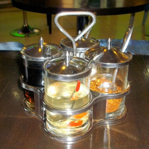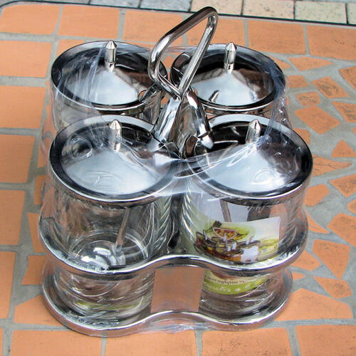 タイではおなじみの調味料入れで、 タイにいったことのある方なら必ず目にしていると思います。 屋台のラーメン屋さんに行くと この4つの入れ物にタイの定番調味料、 砂糖、ナンプラー、酢、唐辛子でラーメンに個人個人が お好みの味付けってのがタイの常識。 タイのラーメンはさっぱりスープでそのままだとちと味気ない んで、唐辛子少しナンプラー少し、んっ!砂糖!!!! 砂糖はちょっととお思いでしょうが、これがまろやかになるんです さー、ご家庭でタイ気分はいかが! もちろん他の調味料を入れても、飴ちゃんなんかを入れても かわいいですよ!! 商品情報 サイズ 容器1個当り 高さ約80×幅60×奥行き60mm スプーン 約110mm ケース 高さ約145×幅138×奥行き138mm 材質 金属 ガラス 原産国 タイランド 配送方法 宅配便 アジア雑貨 アジアン雑貨 エスニック雑貨タイの屋台定番 調味料入れ タイではおなじみの調味料入れで、タイにいったことのある方なら必ず目にしていると思います。屋台のラーメン屋さんに行くとこの4つの入れ物にタイの定番調味料、砂糖、ナンプラー、酢、唐辛子でラーメンに個人個人がお好みの味付けってのがタイの常識。タイのラーメンはさっぱりスープでそのままだとちと味気ないんで、唐辛子少しナンプラー少し、んっ!砂糖!!!!砂糖はちょっととお思いでしょうが、これがまろやかになるんですさー、ご家庭でタイ気分はいかが!もちろん他の調味料を入れても、飴ちゃんなんかを入れてもかわいいですよ!! タイの空港のレストランで同じものを使ってました。 (中身の調味料は付きません。) その他 調味料入れ