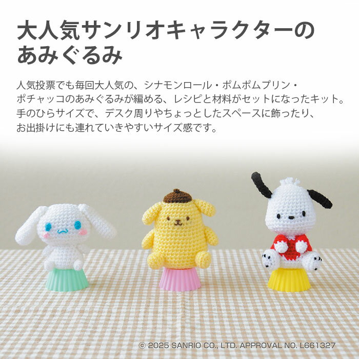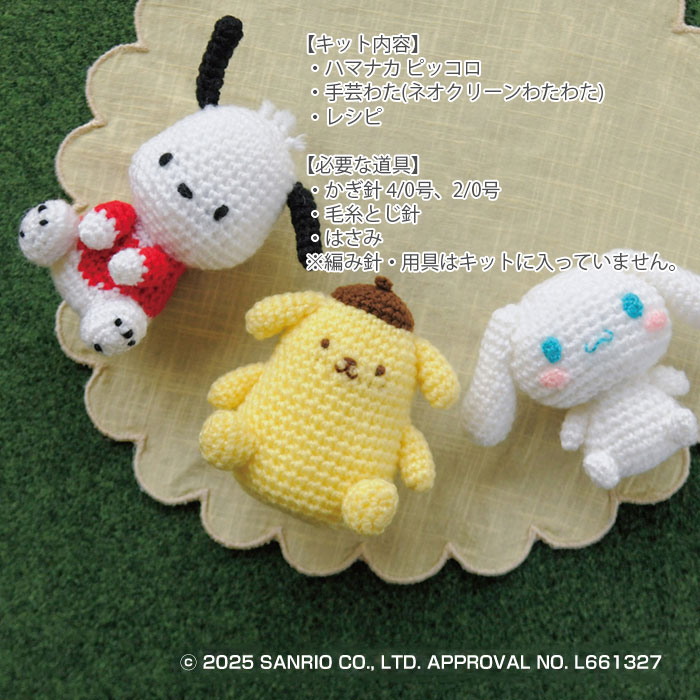 ブランド名 Hamanaka(ハマナカ) 商品名 サンリオあみぐるみキット キット内容 ・ハマナカ ピッコロ ・手芸わた(ネオクリーンわたわた) ・レシピ 用意するもの ・かぎ針 4/0号、2/0号 ・毛糸とじ針 ・はさみ ※キットに含まれておりません。 出来上がりサイズ 高さ 約7.5~10cm 商品説明 人気投票でも毎回大人気の、シナモンロール・ポムポムプリン・ポチャッコのあみぐるみが編める、レシピと材料がセットになったキット。 手のひらサイズで、デスク周りやちょっとしたスペースに飾ったり、お出掛けにも連れていきやすいサイズ感です。 注意事項 ・WEBの性質上、パソコンの設定や環境で実際の商品とカラーが若干異なる場合がございます。 ・製造上の都合、毛糸に1〜2箇所結び目が生じる場合がございます。ブランド名 Hamanaka(ハマナカ) 商品名 サンリオあみぐるみキット キット内容 ・ハマナカ ピッコロ ・手芸わた(ネオクリーンわたわた) ・レシピ 用意するもの ・かぎ針 4/0号、2/0号 ・毛糸とじ針 ・はさみ ※キットに含まれておりません。 出来上がりサイズ 高さ 約7.5~10cm 商品説明 人気投票でも毎回大人気の、シナモンロール・ポムポムプリン・ポチャッコのあみぐるみが編める、レシピと材料がセットになったキット。 手のひらサイズで、デスク周りやちょっとしたスペースに飾ったり、お出掛けにも連れていきやすいサイズ感です。 注意事項 ・WEBの性質上、パソコンの設定や環境で実際の商品とカラーが若干異なる場合がございます。 ・製造上の都合、毛糸に1〜2箇所結び目が生じる場合がございます。