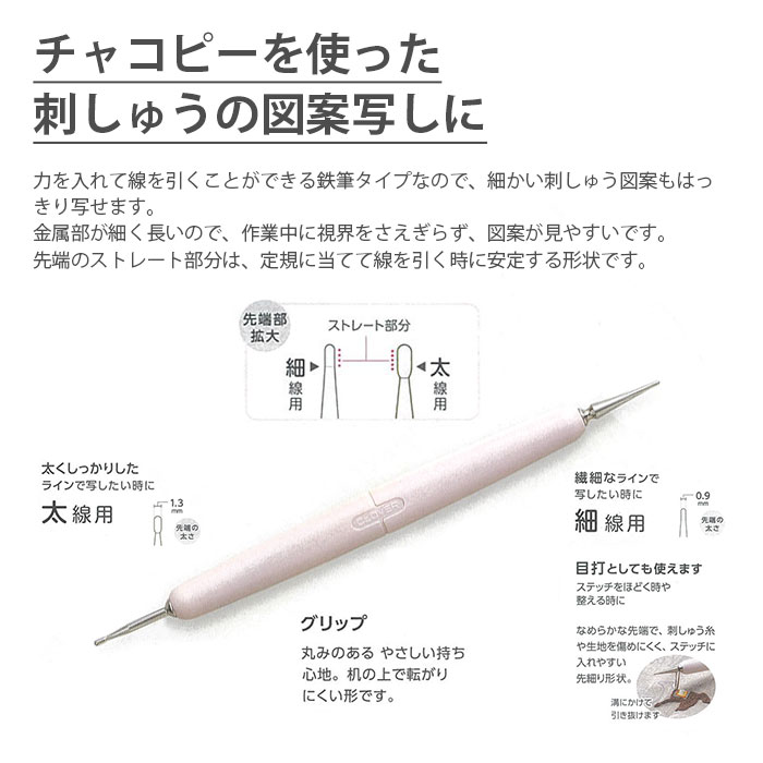 ブランド名 Clover(クロバー) 商品名 トレーサー 〈鉄筆タイプ〉 種類・内容 ・太線用 1.3mm ・細線用 0.9mm パッケージサイズ 55×185×12mm 商品説明 チャコピーを使った刺しゅうの図案写しに使える、太線用・細線用2wayタイプのトレーサー。 力を入れて線を引くことができる鉄筆タイプなので、細かい刺しゅう図案もはっきり写せます。 金属部が細く長いので、作業中に視界をさえぎらず、図案が見やすいです。 先端のストレート部分は、定規に当てて線を引く時に安定する形状です。 注意事項 ・WEBの性質上、パソコンの設定や環境で実際の商品とカラーが若干異なる場合がございます。 メーカー希望小売価格はメーカーカタログに基づいて掲載していますブランド名 Clover(クロバー) 商品名 トレーサー 〈鉄筆タイプ〉 種類・内容 ・太線用 1.3mm ・細線用 0.9mm パッケージサイズ 55×185×12mm 商品説明 チャコピーを使った刺しゅうの図案写しに使える、太線用・細線用2wayタイプのトレーサー。 力を入れて線を引くことができる鉄筆タイプなので、細かい刺しゅう図案もはっきり写せます。 金属部が細く長いので、作業中に視界をさえぎらず、図案が見やすいです。 先端のストレート部分は、定規に当てて線を引く時に安定する形状です。 注意事項 ・WEBの性質上、パソコンの設定や環境で実際の商品とカラーが若干異なる場合がございます。