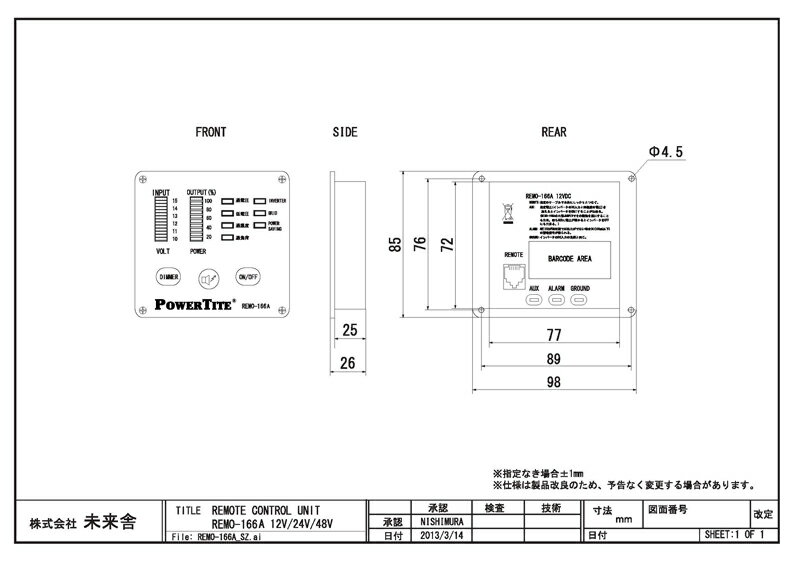■REMO-166A リモコン 【特徴】 インジケーター付きリモコン、インバーター本体を離れた所からON/OFFすることができるようになります。12V/24V/48Vそれぞれ専用となります。 ブザー音 エンジンキー作動端子 入力電圧表示/出力電力表示 過電圧警報ランプ/低電圧警報ランプ/過温度警報ランプ/過負荷警報ランプ 節電モード表示 付属のリモコンコードは約7m 【仕様】 型名 REMO-166A 対応機種 FI-S703A/FI-S1003/FI-S1503A/FI-S2003/FI-S3003/FI-SUシリーズ(FI-SU603除く) 表示項目 入力電圧レベル/出力電力レベル/過電圧/低電圧/過温度/過負荷/動作モード 付属ケーブル長 約7m(注)12V用か24V用を選択して下さい。