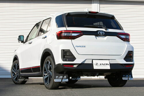 商品情報【商品名】JAOS MADGUARD III F&R setジャオス マッドガード3 前後セット【設定車種】 対応車種: TOYOTA RAIZE 年式: 2019/11〜 【特長】 <カラー>ブラック <セット内容> 車種専用取付ブラケット、ボルト、型紙、マッドガード、ハンガーベルト(ブラック)、アルミプレート <備考> ● 装着には加工が必要です。 ● 商品は1台分(前後)セットです。【納期】こちらの商品はメーカー取寄せです。メーカーに在庫がある場合で3〜4日程でご用意可能です。但し、メーカーが在庫を切らしている場合には商品のご用意にお時間が掛かる場合がございます。※ お急ぎご入用の場合にはご注文前に一度納期をお問合せ下さい。【注意事項】御注文をいただける際には装着可否もございますので装着予定の車種、グレード、年式、型式、をご記入下さいませ。● 通信販売お取扱店舗矢東タイヤ杉並店(木曜定休)(TEL:03-3247-3811)お電話でのお問い合わせは上記店舗宛てにお願いします。● 記載対応車種でも車輌の個体差、諸条件により装着できない場合があります。<車検について>製品のご使用はユーザー様の責任において道路運送法の保安基準の合致内容をご理解の上ご使用下さい。※ メーカー直送品を除き商品の検品のため弊社で一度開封しております。※掲載写真は商品イメージです。車種、仕様により現品と異なります。JAOS MAD GUARD III F&R setジャオス マッドガード3 前後セット大型マッドガードのウィークポイント(巻込みと巻上げ)を、PPベルトとフラップ下端に配されたジェットホールで軽減。4×4&SUVリヤビューの定番!!JAOSマッドガードは一味違います。★こちらの商品の詳しい説明は JAOSのホームページをご覧ください★こちらの商品のお問合せは矢東タイヤ杉並店(木曜定休)(TEL:03-3247-3811)まで