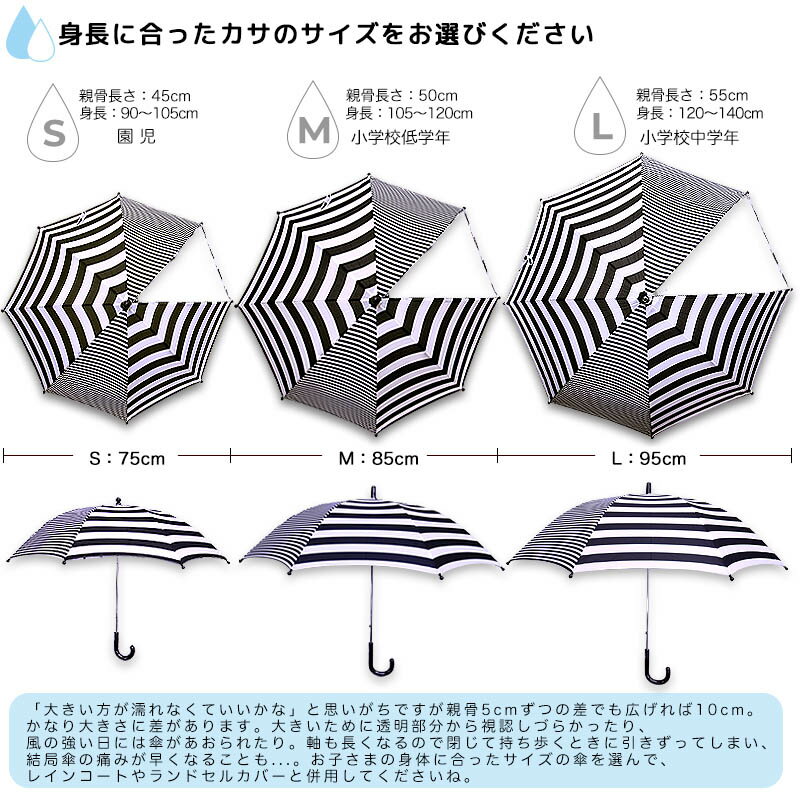 商品説明 【素材】 ポリエステル100%など 【サイズ】 M(親骨)50cm (対象身長:105-120cm 小学校低学年向け) L(親骨)55cm (対象身長:120-140cm 小学校高学年向け) ・詳細は説明画像をご覧ください。 シンプルなデザインはお受験や面接、私立幼稚園・小学校の通園通学にも最適です。 *丈夫で安全な骨組み。 骨の一部にグラスファイバーを使用。軽くて丈夫です。 *さびにくく長持ち。 めっき加工に時間をかけているので錆び止めが長持ちします。 *手が痛くない。 安全ストッパー構造で、お子様でも手を挟みません。 *暗い時も安心 反射テープ付きなので暗い道でも安心。 透明窓も2面なので視認性も優れています。 *こちらのカサは手開き式です*