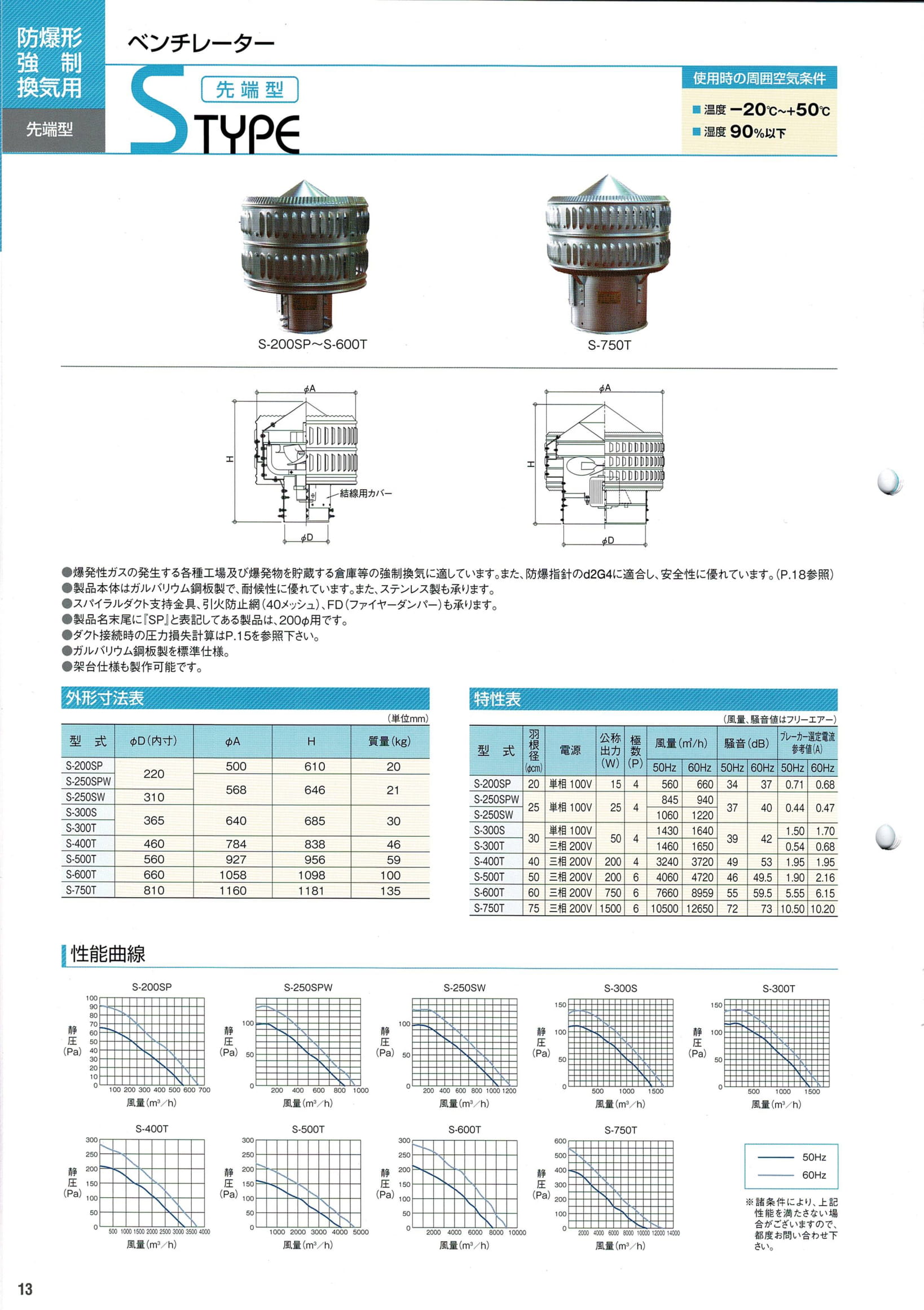 商品詳細 【商品名】 S-200SP型 【用途】 爆発性ガスの発生する各種工場及び爆発物を貯蔵する倉庫等の強制換気に最も適した換気扇です。 【仕様】 ファン径200φ、単相、100V、15w、4P 【外形寸法】 Dφ220(適合袴部φ210)×Aφ500×H610 【風量】 50hz:560CMH、60hz:660CMH 【材質】 ガルバリウム鋼板製 【概略質量】 約20Kg 【構造規格】 耐圧防爆d2G4 【メーカー】 三和式ベンチレーター(株) 【追加送料】 北海道・沖縄・離島は別途送料が掛かります。 【返品不可】 この商品は受注生産品の為、お客様のご都合による返品はお受けできません。 【建設業許可】 東京都知事 第143494号 【サポート】 建築士・建築施工管理技士が対応いたします。 【合格証】 防爆検定合格証が必要な場合はご連絡ください。 【オプション】 スパイラルダクト用【防火網】、【FD】もオプションでご用意しています。 オプションのご用命は本体ご購入の際オプションのご注文の欄にご記入ください。 ステンレス製も取り揃えています。【 三和式 S-200SP型 】 ※防爆検定合格証や施工方法などご不明な点がございましたらご連絡ください。建築士・建築施工管理技士が対応いたします。 スパイラルダクト用【防火網】、【FD】もオプションでご用意しています。オプションのご用命は本体ご購入の際オプションのご注文の欄にご記入ください。ステンレス製も取り揃えています。 【返品不可商品】※受注生産品の為、お客様のご都合による返品はお受けできません。