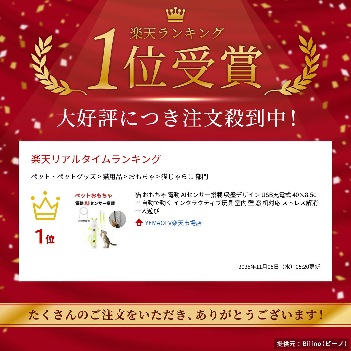 商品情報 検索キーワード 猫 おもちゃ 電動 猫おもちゃ USB充電 吸盤デザイン 商品詳細 【サイズ40×8.5cm・省スペース設計】吸盤固定で壁やガラス、床に簡単設置。限られた室内でも遊び場をしっかり確保できます。 商品特徴 【AIセンサー搭載・自動反応】猫が近づくとセンサーが感知し、ふわふわ尻尾が不規則に動き、狩猟本能を刺激して夢中で遊べます。 【USB充電式・繰り返し使える】600mAhバッテリー内蔵、2.5時間でフル充電。電池交換不要で経済的&エコ。 【安心素材&お手入れ簡単】耐久性のあるABS樹脂を使用し、落としても壊れにくい。表面はなめらか加工で猫の口元も安全、汚れてもサッと拭くだけで清潔。商品情報 検索キーワード 猫 おもちゃ 電動 猫おもちゃ USB充電 吸盤デザイン 商品詳細 【サイズ40×8.5cm・省スペース設計】吸盤固定で壁やガラス、床に簡単設置。限られた室内でも遊び場をしっかり確保できます。 商品特徴 【AIセンサー搭載・自動反応】猫が近づくとセンサーが感知し、ふわふわ尻尾が不規則に動き、狩猟本能を刺激して夢中で遊べます。 【USB充電式・繰り返し使える】600mAhバッテリー内蔵、2.5時間でフル充電。電池交換不要で経済的&エコ。 【安心素材&お手入れ簡単】耐久性のあるABS樹脂を使用し、落としても壊れにくい。表面はなめらか加工で猫の口元も安全、汚れてもサッと拭くだけで清潔。