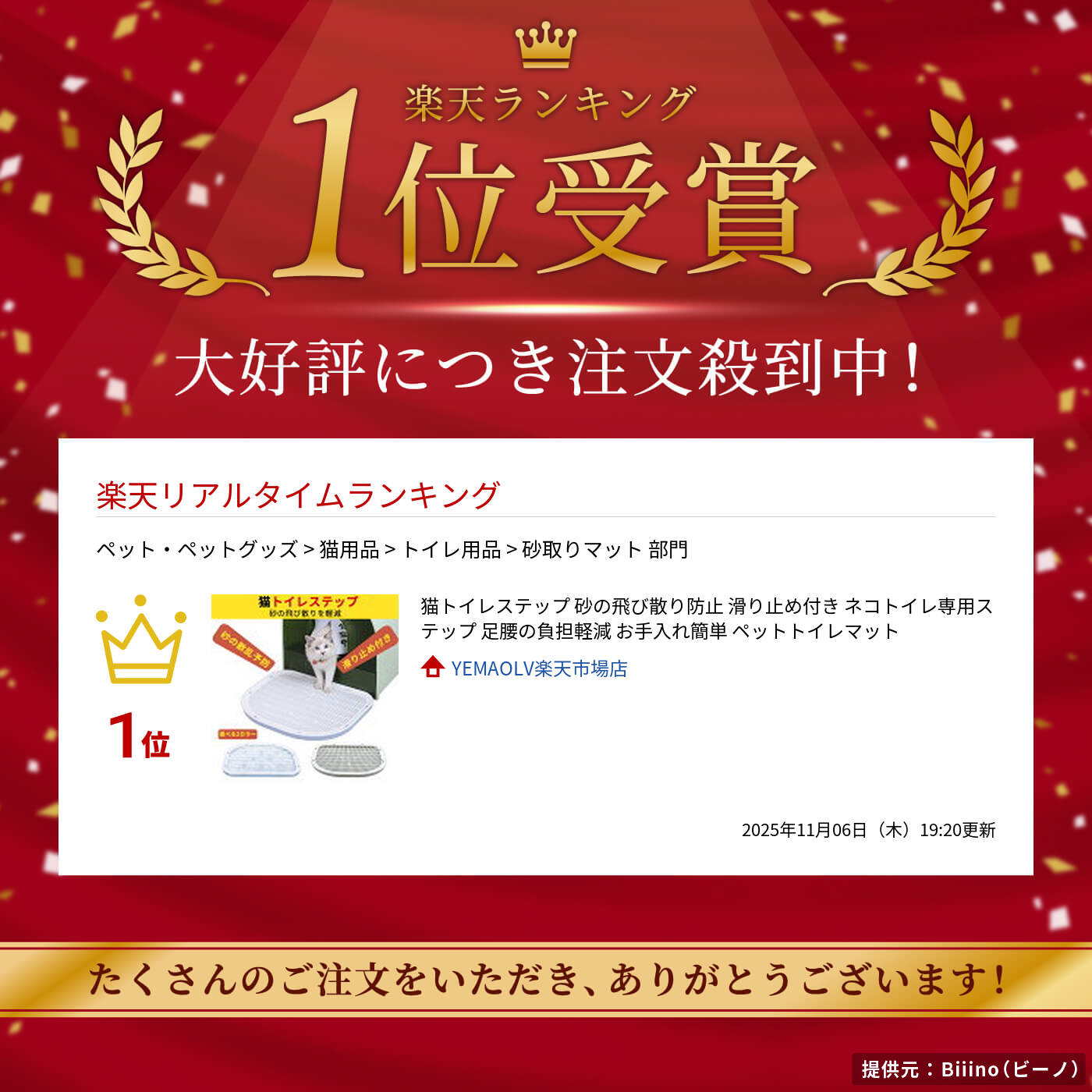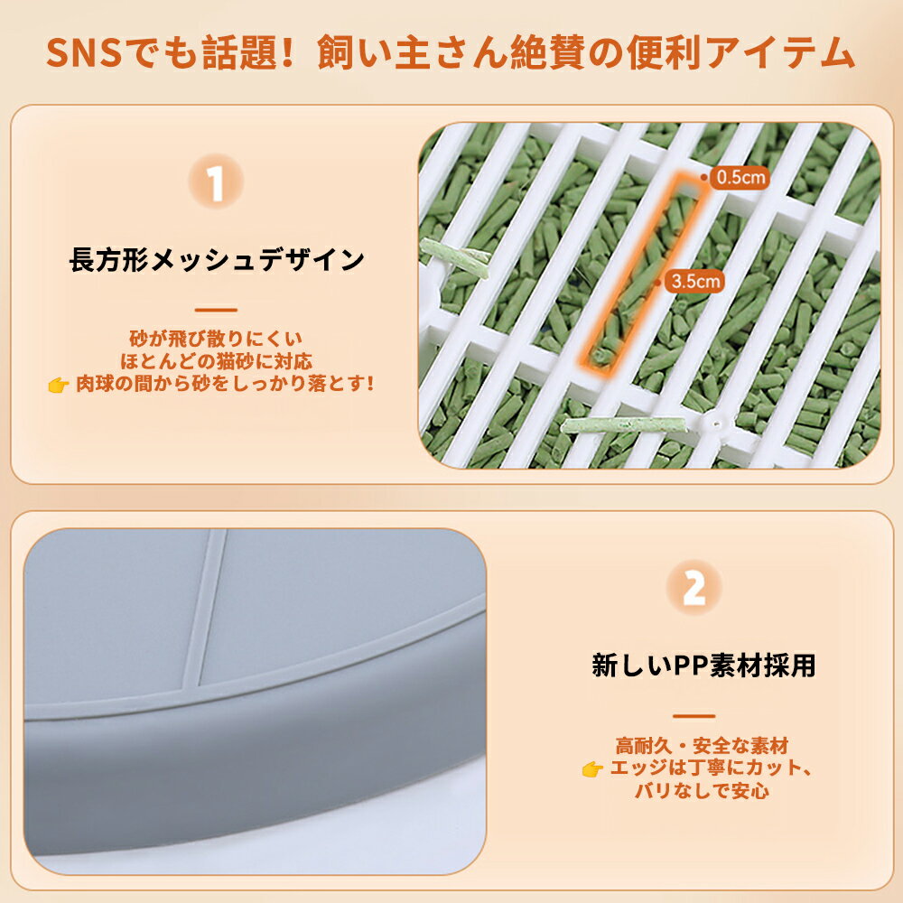 商品情報 検索キーワード 猫砂マット 猫トイレマット キャットステップ 猫 ステップ 商品詳細 サイズ:50長さ x 39.5幅 x 3高さ cm 商品特徴 【砂の飛び散りをしっかりガード】トイレ出口に置くだけで、肉球に付いた砂をキャッチ。床の汚れやお掃除の手間を大幅に減らします。 【足腰にやさしい低段差デザイン】高さわずか約3cmのステップで、短足猫やシニア猫でもラクに上り下り。トイレへのアクセスをスムーズに。 【丸洗い&簡単お手入れ】汚れてもシャワーで丸洗いOK。乾きやすい素材なので、いつでも清潔を保てます。 【滑り止め付きで安心使用】底面に滑り止め加工を施しており、ズレにくく安定感抜群。猫ちゃんが飛び乗っても安心です。商品情報 検索キーワード 猫砂マット 猫トイレマット キャットステップ 猫 ステップ 商品詳細 サイズ:50長さ x 39.5幅 x 3高さ cm 商品特徴 【砂の飛び散りをしっかりガード】トイレ出口に置くだけで、肉球に付いた砂をキャッチ。床の汚れやお掃除の手間を大幅に減らします。 【足腰にやさしい低段差デザイン】高さわずか約3cmのステップで、短足猫やシニア猫でもラクに上り下り。トイレへのアクセスをスムーズに。 【丸洗い&簡単お手入れ】汚れてもシャワーで丸洗いOK。乾きやすい素材なので、いつでも清潔を保てます。 【滑り止め付きで安心使用】底面に滑り止め加工を施しており、ズレにくく安定感抜群。猫ちゃんが飛び乗っても安心です。