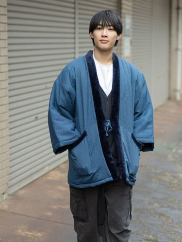 表地に繊細なドビー織を使用し、裏地にはふんわりとしたボア素材を施した紳士用半纏です。 上品な織り柄が落ち着いた印象を与え、和の趣を感じるデザインに仕上げました。 裏ボアがしっかりと体を包み込み、寒い季節でも快適な暖かさをキープ。 軽くて動きやすく、室内でのくつろぎ時間やちょっとした外出にもぴったりです。 伝統と機能性を兼ね備えた、秋冬の定番防寒アイテムです。 【おすすめ利用シーン】 秋冬/春先/寒がりさんに/防寒対策/在宅/おうち時間/リラックス/ワンマイルウェア/読書/テレビ鑑賞/お昼寝/家事の合間/冷え対策/肩・背中あったか/軽量/洗える/和風ルームウェア/和モダン/和装イベント/年末年始/初詣/お正月/お寺参り/温泉旅行/旅館滞在/神社仏閣めぐり/散歩/庭仕事/家庭菜園/体型カバー/ゆったりシルエット/中高年男性/60代/70代/80代/父の日/敬老の日/誕生日ギフト (単位:cm) 着丈 身幅 肩幅 袖丈 M 80.5 68 68 42 L 83.5 70 70 43 LL 86.5 72 72 44ブラックネイビーネイビー:back
