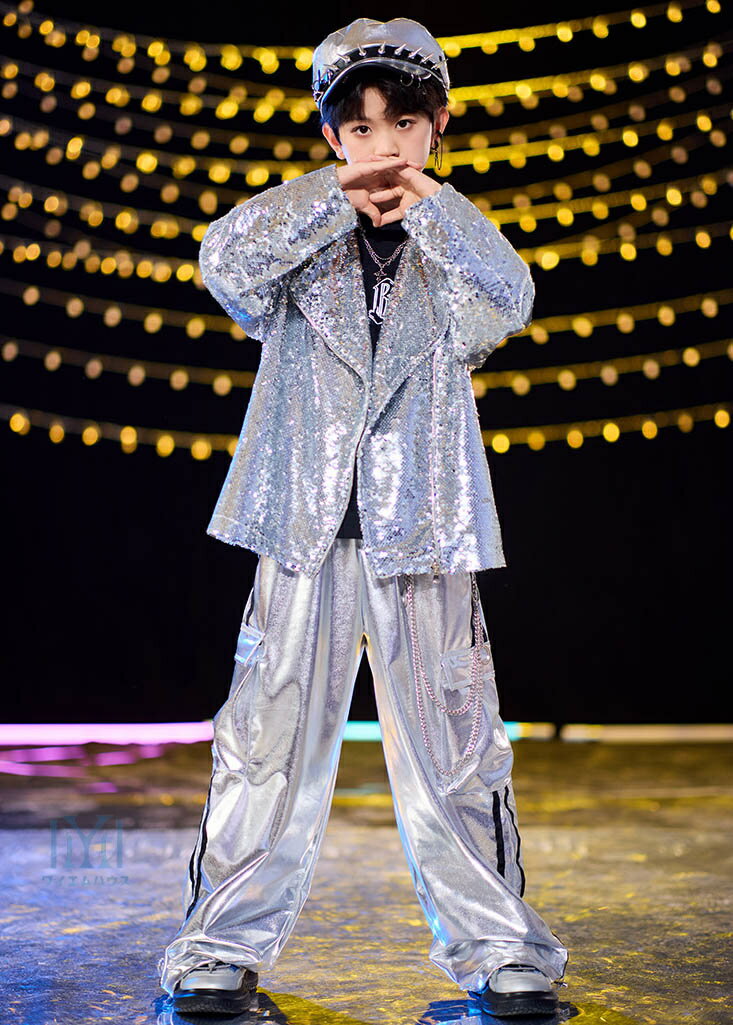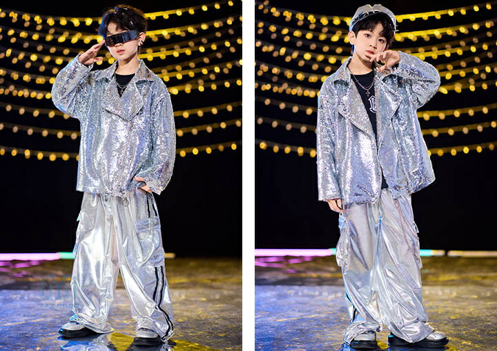 キッズ ダンス衣装 hiphop ヒップホップ スパンコール セットアップ ダンスパンツ シルバー キラキラ スカート 長袖ジャケット ロングパンツ 男の子 女の子 k-pop衣装 韓国ファション ステージ衣装 子ども服 レッスン着 発表会 応援団 ダンスウェア 演出服 目立つ カッコイイ