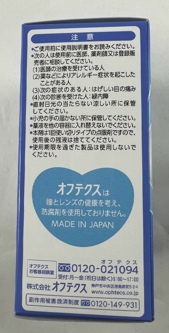 商品名:【第3類医薬品】オフテクス ティアーレW 0.5ml×30本 目薬+装着液内容量:0.5mLJANコード:4950055501242発売元、製造元、輸入元又は販売元:オフテクス原産国:日本区分:第三類医薬品商品番号:103-4950055501242□□□ 商品説明 □□□目薬+装着液Wの機能・1本でコンタクトレンズの装着時にも、ドライアイ(目の乾き)症状時のうるおい補給の目薬としても使えて便利です。・コンタクトレンズを装用されていない方にもおすすめです。うるおい成分配合・ヒアルロン酸Naとヒプロメロースの働きで、レンズのうるおいをキープし、快適な装用感をサポートします。・涙が蒸発しやすく乾燥しがちなコンタクトレンズ装着時の目のうるおいを補給します。防腐剤フリー・防腐剤は角膜上皮に障害を与える危険性があり、特に点眼回数が増えがちなドライアイの方は注意が必要です。・「ティアーレ W」は防腐剤フリーなので、ドライアイの方にも安心してお使いいただけます。□□□ 使用上の注意 □□□◆相談すること1.次の人は使用前に医師、薬剤師又は登録販売者に相談してください。(1)医師の治療を受けている人(2)薬などによりアレルギー症状を起こしたことがある人(3)次の症状のある人 :はげしい目の痛み(4)次の診断を受けた人 :緑内障2.使用後、次の症状があらわれた場合は副作用の可能性があるので、直ちに使用を中止し、この文書を持って医師、薬剤師又は登録販売者に相談してください。<関係部位:症状>〔皮膚〕発疹・発赤、かゆみ〔目〕充血、かゆみ、はれ3.次の場合は使用を中止し、この文書を持って医師、薬剤師又は登録販売者に相談してください。(1)目のかすみが改善されない場合(2)2週間位使用しても症状がよくならない場合使用期限まで100日以上ある医薬品をお届けします。□□□ 効果・効能 □□□<点眼の場合>目の疲れ、涙液の補助(目のかわき)、ハードコンタクトレンズ又はソフトコンタクトレンズを装着しているときの不快感、目のかすみ(目やにの多いときなど)<コンタクトレンズ装着の場合>ハードコンタクトレンズ又はソフトコンタクトレンズの装着を容易にする。□□□ 用法・用量 □□□<点眼の場合>1日3回 6回、1回2 3滴を点眼する。<コンタクトレンズ装着の場合>コンタクトレンズの両面を本液の1 2液でぬらしたのち装着する。<用法・用量に関連する注意>(1)小児に使用させる場合は、保護者の指導監督のもとで使用させてください。(2)容器の先をまぶた、まつ毛、コンタクトレンズ、指に触れさせないでください。(3)キャップ部分を軽く引っ張りながら、ゆっくりまわして開封してください。(勢いよく開封すると、薬液が飛び散る場合があります。)(4)混濁したものや変色したものは使用しないでください。(5)点眼用、コンタクトレンズ装着用として使用してください。□□□ 成分・分量 □□□塩化ナトリウム0.74%、塩化カリウム0.13%、ヒプロメロース0.2%添加物として、無水リン酸ニ水素Na、無水リン酸一水素Na、ヒアルロン酸Na、pH調節剤を含有する。□□□ 保管および取扱い上の注意 □□□(1)直射日光の当たらない涼しい所に保管してください。(2)小児の手の届かない所に保管してください。(3)薬液を他の容器に入れかえないでください。(誤用の原因になったり、品質が変わる恐れがあります。)(4)1本を他の人と共用しないでください。(5)使用後に薬液が残っていても、再使用しないでください。(6)使用期限を過ぎた製品は使用しないでください。また、使用期限内であっても、一度内袋を開封した後はすみやかに使用してください。(7)本剤を携帯する際、ズボンの後ろのポケット等に入れないでください。(キャップ部分が折れて開いてしまう恐れがあります。)□□□ お問い合わせ先 □□□お問い合わせ(株)オフテクス お客様相談室TEL:0120-021094受付時間:月 金(祝日は除く)9時 17時文責:アットライフ株式会社 登録販売者 尾籠 憲一広告文責:アットライフ株式会社TEL:050-3196-1510医薬品販売に関する記載事項はこちら ⇒第3類医薬品広告文責:アットライフ株式会社TEL 050-3196-1510 ※商品パッケージは変更の場合あり。メーカー欠品または完売の際、キャンセルをお願いすることがあります。ご了承ください。