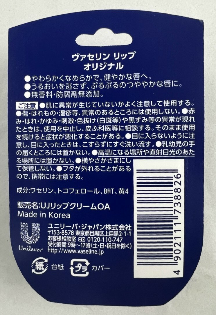 【×6個セットメール便送料込】ユニリーバ ヴァセリン Vaseline リップ オリジナル 7g 唇の表面をヴァセリンリップがコーティング 保湿リップクリーム (4902111738826 )