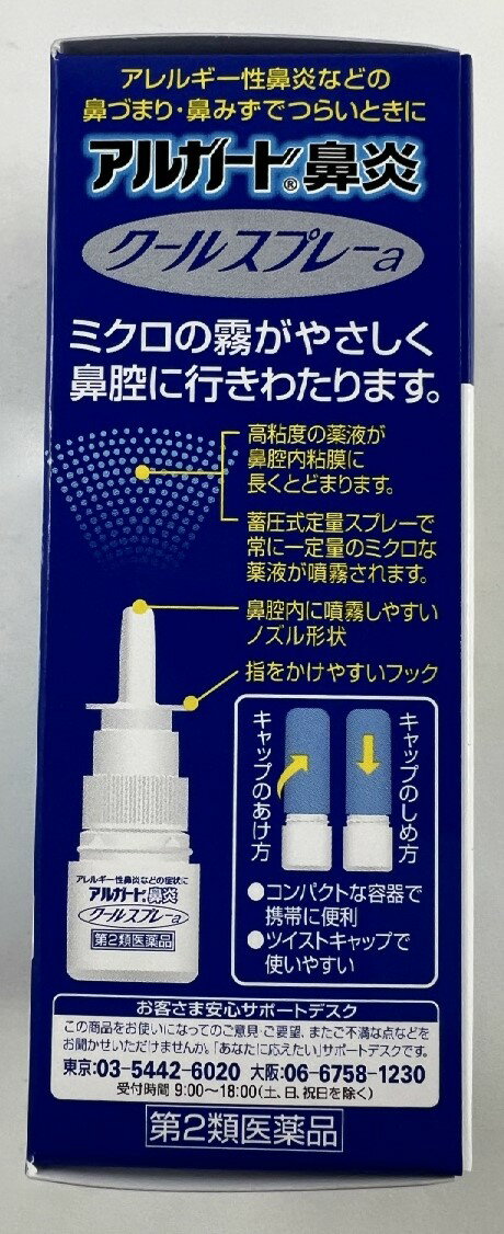 商品名:【第2類医薬品】アルガード 鼻炎クールスプレーa 15ml内容量:15mlJANコード:4987241100200発売元、製造元、輸入元又は販売元:ロート製薬原産国:日本区分:第二類医薬品商品番号:103-4987241100200□□□ 販売店舗 □□□アットライフ加西薬店(兵庫県加西市)情報提供・相談応需:販売店舗の登録販売者□□□ 商品説明 □□□「アルガード 鼻炎クールスプレーa 15ml」は、一定量の薬液がミクロの霧となり、鼻腔内の炎症部位に直接行き渡る鼻炎薬です。花粉やホコリなどによるアレルギーが原因の鼻づまり・鼻みずを改善します。液ダレしにくい薬液が鼻腔内粘膜に長くとどまるので、鼻粘膜をしっとりさせます。清涼化剤、L-メントール/ミントオイル配合で、スッキリした使用感です。医薬品。□□□ 使用上の注意 □□□●してはいけないこと(守らないと現在の症状が悪化したり、副作用・事故が起こりやすくなる)長期連用しないで下さい。●相談すること1.次の人は服用前に医師又は薬剤師にご相談ください。・医師の治療を受けている人・妊婦又は妊娠していると思われる人・本人又は家族がアレルギー体質の人・薬によりアレルギー症状を起こしたことがある人・次の診断を受けた人高血圧、心臓病、糖尿病、甲状腺機能障害、緑内障2.次の場合は直ちに服用を中止し、この説明書を持って医師又は薬剤師にご相談ください。・使用後、次の症状があらわれた場合*皮膚:発疹・発赤、かゆみ*鼻:はれ、刺激感・3日間使用しても症状がよくならない場合使用期限まで100日以上ある医薬品をお届けします。□□□ 効果・効能 □□□急性鼻炎、アレルギー性鼻炎又は副鼻腔炎による次の諸症状の緩和:くしゃみ、鼻みず(鼻汁過多)、鼻づまり、頭重□□□ 用法・用量 □□□次の量を量鼻腔内に噴霧して下さい。・7才以上:1回1-2度ずつ、1日使用回数6回まで(3-4時間ごとに)・7才未満:使用しないこと【用法・用量に関連する注意】・過度に使用するとかえって鼻づまりを起こすことがあるので、用法・用量を厳守して下さい。・小児に使用させる場合には、保護者の指導監督のもとに使用させて下さい。・点鼻用にのみ使用して下さい。【使用方法】使い始めは数回空押しして下さい。1.噴霧口を人差し指と中指の間に挟むようにして容器を持って下さい。2.ノズルを軽く鼻腔内に入れ、静かに息を吸い込みながら、フックを押して下さい。3.使用後はティッシュペーパー等でノズルを拭いて下さい。□□□ 成分・分量 □□□(100ml中)・塩酸テトラヒドロゾリン(100mg)・マレイン酸クロルフェニラミン(500mg)・塩化ベンゼトニウム(20mg)・添加物として、リン酸水素Na、リン酸二水素Na、等張化剤、クロロブタノール、エタノール、l-メントール、ハッカ油、ポリソルベート80、グリセリン、CMC-Naを含有します。□□□ 保管および取扱い上の注意 □□□・直射日光の当たらない、涼しい所に密栓して保管してください。・小児の手の届かない所に保管してください。・他の容器に入れ替えないでください。(誤用の原因になったり品質が変わる)・他の人と共用しないで下さい。・使用期限(外箱に記載)を過ぎた製品は使用しないでください。(スプレーの先端を針等で突くのは、折れた時大変危険ですので、絶対におやめ下さい。)□□□ お問い合わせ先 □□□ロート製薬文責:アットライフ株式会社 登録販売者 尾籠 憲一広告文責:アットライフ株式会社TEL:050-3196-1510医薬品販売に関する記載事項はこちら ⇒第2類医薬品第二類医薬品広告文責:アットライフ株式会社TEL 050-3196-1510 ※商品パッケージは変更の場合あり。メーカー欠品または完売の際、キャンセルをお願いすることがあります。ご了承ください。