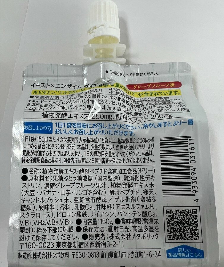 【×30袋セット送料込】メタボリック イースト×エンザイム ダイエットゼリー グレープフルーツ味 150g ダイエットゼリー (4933094031611 )