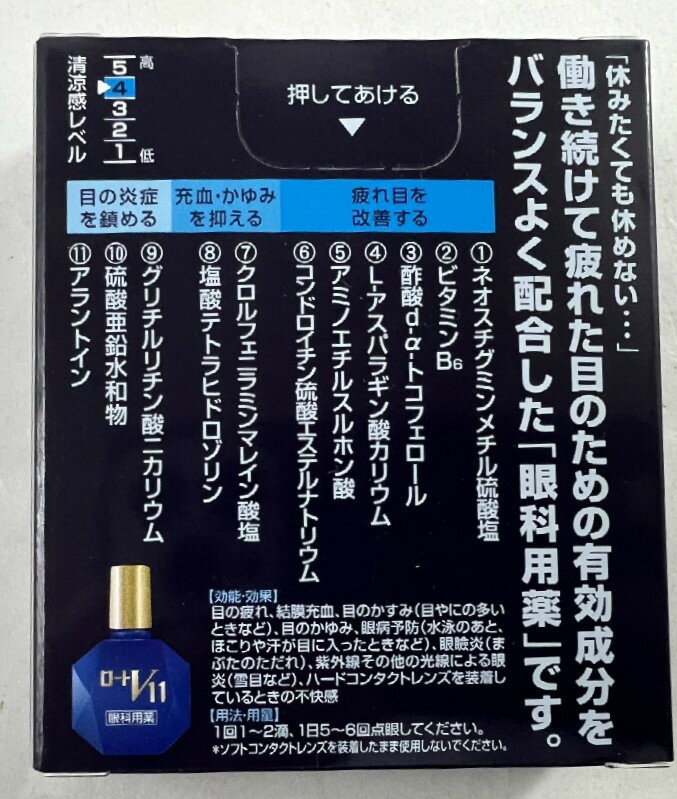 商品名:【第2類医薬品】 ロートV11 13ml内容量:13mlJANコード:4987241100545発売元、製造元、輸入元又は販売元:ロート製薬株式会社原産国:日本区分:第二類医薬品商品番号:103-4987241100545□□□ 商品説明 □□□効果とさし心地にこだわった「ロートV11シリーズ」は、ロート製薬の目薬の中で唯一、抗炎症成分を3種類も配合した目薬。酷使する疲れ目で起きている炎症をしっかり抑えます。さらにピント調節機能改善成分やかゆみ抑制成分、ビタミンなど、合計11種類もの有効成分がバランスよく配合され、複合的に絡み合う「つらい疲れ目」に働きかけます。「ロートV11」は、目が疲れてリフレッシュしたい時にもうれしい、清涼感のある爽やかなさし心地です。□□□ 使用上の注意 □□□◆相談すること1.次の人は使用前に医師、薬剤師又は登録販売者にご相談ください(1)医師の治療を受けている人(2)薬などによりアレルギー症状を起こしたことがある人(3)次の症状のある人:はげしい目の痛み(4)次の診断を受けた人:緑内障2.使用後、次の症状があらわれた場合は副作用の可能性があるので、直ちに使用を中止し、この説明書を持って医師、薬剤師又は登録販売者にご相談ください〔関係部位〕:〔症 状〕皮ふ : 発疹・発赤、かゆみ目 : 充血、かゆみ、はれ、しみて痛い3.次の場合は使用を中止し、この説明書を持って医師、薬剤師又は登録販売者にご相談ください。(1)目のかすみが改善されない場合(2)5 6日間使用しても症状がよくならない場合使用期限120日以上の商品を販売しております□□□ 効果・効能 □□□目の疲れ、結膜充血、目のかすみ(目やにの多いときなど)、目のかゆみ、眼病予防(水泳のあと、ほこりや汗が目に入ったときなど)、眼瞼炎(まぶたのただれ)、紫外線その他の光線による眼炎(雪目など)、ハードコンタクトレンズを装着しているときの不快感□□□ 用法・用量 □□□1回1 2滴、1日5 6回点眼してください。※ソフトコンタクトレンズを装着したまま使用しないでください。□□□ 成分・分量 □□□塩酸テトラヒドロゾリン 0.05%、クロルフェニラミンマレイン酸塩 0.03%、ネオスチグミンメチル硫酸塩 0.005%、ビタミンB6 0.1%、酢酸d-α-トコフェロール 0.05%、L-アスパラギン酸カリウム 1%、タウリン(アミノエチルスルホン酸) 0.5%、アラントイン 0.1%、硫酸亜鉛水和物 0.05%、グリチルリチン酸ニカリウム 0.1%、コンドロイチン硫酸エステルナトリウム 0.1%※添加物として、ホウ酸、ホウ砂、l-メントール、dl-カンフル、エデト酸Na、ポリソルベート80、ポリオキシエチレン硬化ヒマシ油、クロロブタノール、ベンザルコニウム塩化物、pH調節剤を含有します。□□□ 保管および取扱い上の注意 □□□(1)直射日光の当たらない涼しい所に密栓して保管してください。品質を保持するため、自動車内や暖房器具の近くなど、高温の場所(40℃以上)に放置しないでください。(2)キャップを閉める際は、カチッとするまで回して閉めてください。(3)小児の手の届かない所に保管してください。(4)他の容器に入れ替えないでください。(誤用の原因になったり品質が変わる)(5)他の人と共用しないでください。(6)使用期限(外箱に記載)を過ぎた製品は使用しないでください。なお、使用期限内であっても一度開封した後はなるべく早くご使用ください。(7)保存の状態によっては、成分の結晶が容器の先やキャップの内側につくことがあります。その場合には清潔なガーゼ等で軽くふきとってご使用ください。(8)容器に他の物を入れて使用しないでください。□□□ お問い合わせ先 □□□お問合せ:ロート製薬株式会社 大阪市生野区巽西1-8-1 お客さま安心サポートデスク(東京)03-5442-6020 (大阪)06-6758-1230受付時間:9:00 18:00(土,日,祝日を除く)文責:アットライフ株式会社 登録販売者 尾籠 憲一広告文責:アットライフ株式会社TEL:050-3196-1510医薬品販売に関する記載事項はこちら ⇒第二類医薬品広告文責:アットライフ株式会社TEL 050-3196-1510 ※商品パッケージは変更の場合あり。メーカー欠品または完売の際、キャンセルをお願いすることがあります。ご了承ください。