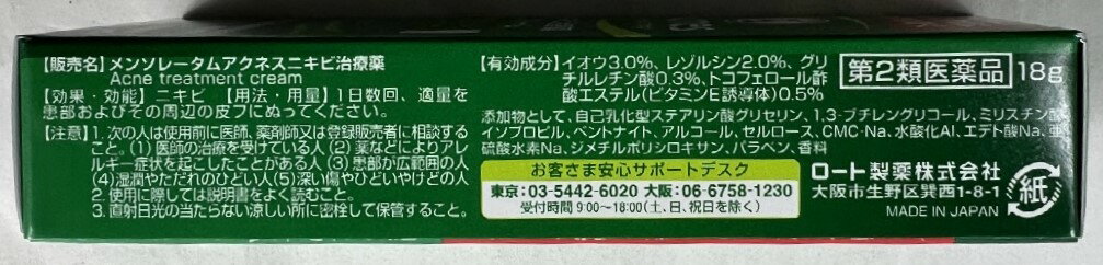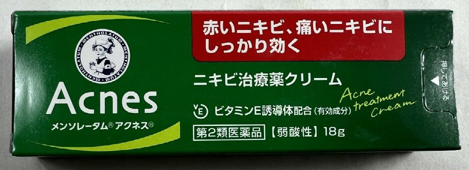 商品名:【第2類医薬品】メンソレータム アクネス ニキビ治療薬 18g内容量:18gJANコード:4987241108817発売元、製造元、輸入元又は販売元:ロート製薬原産国:日本区分:第二類医薬品商品番号:103-4987241108817□□□ 販売店舗 □□□アットライフ加西薬店(兵庫県加西市)情報提供・相談応需:販売店舗の登録販売者□□□ 商品説明 □□□「メンソレータム アクネス ニキビ治療薬 18g」は、赤いニキビ、痛いニキビをしっかり治すニキビ治療薬です。殺菌効果のあるレゾルシン、角質柔軟効果・抗菌作用のあるイオウ、消炎効果のあるグリチルレチン酸にくわえ、新陳代謝を促進するビタミンE誘導体を配合しました。のびが良く、基材の臭いも気にならない、気持ちよく使用できるクリームです。医薬品。□□□ 使用上の注意 □□□●相談すること1.次の人は、使用前に医師又は薬剤師にご相談ください。(1)医師の治療を受けている人(2)本人又は家族がアレルギー体質の人(3)薬によりアレルギー症状を起こしたことがある人(4)患部が広範囲の人(5)湿潤やただれのひどい人(6)深い傷やひどいやけどの人2.次の場合は、直ちに使用を中止し、この説明書を持って医師又は薬剤師にご相談ください。(1)使用後、次の症状があらわれた場合関係部位症状皮膚発疹・発赤、かゆみ、かぶれ(2)5-6日間使用しても症状がよくならない場合や、本剤の使用により症状が悪化した場合使用期限まで100日以上ある医薬品をお届けします。□□□ 効果・効能 □□□ニキビ□□□ 用法・用量 □□□洗顔後に1日数回、適量を患部およびその周辺の皮膚にぬってください。(用法・用量に関連する注意)1.使用前に少量を塗布して一晩そのままにしておき、翌朝、塗布部位に過敏症状(発疹・発赤、かゆみ等)があらわれた場合は使用をおさけください。2.目に入らないように注意ください。万一、目に入った場合には、すぐに水またはぬるま湯で洗い、ただちに眼科医の診療を受けてください。3.小児に使用させる場合には保護者の指導監督のもとに使用させてください。乳幼児にはご使用にならないでください。4.外用にのみ使用してください。□□□ 成分・分量 □□□有効成分分量作用イオウ3%角質を軟化、皮脂を吸収し、原因菌の増殖を防ぐ。レゾルジン2%アクネ菌を殺菌。グリチルレチン酸0.3%炎症・赤みを抑える。酢酸トコフェロール(ビタミンE誘導体)0.5%新陳代謝を促進し、皮膚の生まれ変わりを早める。添加物として、自己乳化型ステアリン酸グリセリン、1.3-ブチレングリコール、ミリスチン酸イソプロピル、ベントナイト、アルコール、セルロース、CMC-Na、水酸化Al、パラベン、エデト酸Na、亜硫酸水素Na、ジメチルポリシロキサン、香料を含む。□□□ 保管および取扱い上の注意 □□□(1)直射日光の当たらない涼しいところに密栓して保管してください。(2)小児の手の届かないところに保管してください。(3)他の容器に入れ替えないでください。(誤用の原因となったり品質が変わる)(4)使用期限(外箱に記載)を過ぎた製品は使用しないでください。なお、使用期限内であっても、一度開封した後はなるべく早くご使用ください。□□□ お問い合わせ先 □□□ロート製薬文責:アットライフ株式会社 登録販売者 尾籠 憲一広告文責:アットライフ株式会社TEL:050-3196-1510医薬品販売に関する記載事項はこちら ⇒第2類医薬品第二類医薬品広告文責:アットライフ株式会社TEL 050-3196-1510 ※商品パッケージは変更の場合あり。メーカー欠品または完売の際、キャンセルをお願いすることがあります。ご了承ください。