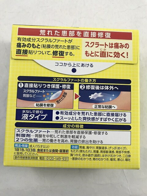 商品名:【第2類医薬品】ライオン スクラートG 12包入内容量:12包JANコード:4903301276326発売元、製造元、輸入元又は販売元:ライオン(株)原産国:日本区分:第二類医薬品商品番号:103-4903301276326□□□ 商品説明 □□□胃痛・胃酸の逆流などで胸がやける荒れた患部を直接修復水なしで飲む液タイプ有効成分を荒れた患部に直接届けます。スーッとした爽快感がすばやく広がります。◆痛みのもと(粘膜の荒れた患部)を直接保護・修復しますスクラルファートが荒れた患部に直接貼りついて、胃酸などの攻撃から保護するとともに、患部を修復して、もとから治していきます。◆すばやく、かつ持続的に胃酸を中和しますメタケイ酸アルミン酸マグネシウムと合成ヒドロタルサイトが胃酸をすばやくかつ持続的に中和して粘膜への刺激を軽減します。◆2つの生薬が胃の働きを助けますコウボクとソウジュツが胃の働きを高め、胃酸の排出を助けます。□□□ 使用上の注意 □□□●してはいけないこと(守らないと現在の症状が悪化したり、副作用が起こりやすくなる)1.次の人は服用しないでください透析療法を受けている人。2.長期連続して服用しないでください●相談すること1.次の人は服用前に医師、薬剤師又は登録販売者に相談してください(1)医師の治療を受けている人。(2)次の診断を受けた人。腎臓病2.服用後、次の症状があらわれることがあるので、このような症状の持続又は増強が見られた場合には、服用を中止し、添付文書を持って医師、薬剤師又は登録販売者に相談してください便秘、口の渇き、吐き気3.2週間位服用しても症状がよくならない場合は服用を中止し、添付文書を持って医師、薬剤師又は登録販売者に相談してください使用期限120日以上の商品を販売しております□□□ 効果・効能 □□□胃痛、胸やけ、胃酸過多、げっぷ(おくび)、もたれ(胃もたれ)、胃重、胃部膨満感、胃部不快感、胸つかえ、飲み過ぎ(過飲)、吐き気(むかつき、二日酔・悪酔のむかつき、胃のむかつき、嘔気、悪心)、嘔吐□□□ 用法・用量 □□□次の量を食前または食間・就寝前に服用してください。成人(15才以上)・・・1回量1包、1日服用回数3回15才未満・・・服用しないでください●用法・用量に関連する注意(1)用法・用量を厳守してください。(2)中身をしぼり出すように服用してください。□□□ 成分・分量 □□□1日服用量(3包・17.4g)中スクラルファート水和物・・・1500mgメタケイ酸アルミン酸マグネシウム・・・1500mg合成ヒドロタルサイト・・・750mgコウボク流エキス・・・0.6mL(原生薬換算量・・・0.6g)ソウジュツ流エキス・・・0.6mL(原生薬換算量・・・0.6g)添加物として、キサンタンガム、アルギン酸プロピレングリコールエステル、乳酸、炭酸水素Na、ポリオキシエチレン硬化ヒマシ油、パラベン、エタノール、スクラロース、l-メントール、香料を含有する。つかえ、飲み過ぎ(過飲)、吐き気(むかつき、二日酔・悪酔のむかつき、胃のむかつき、嘔気、悪心)、嘔吐□□□ 保管および取扱い上の注意 □□□(1)直射日光の当たらない涼しい所に保管してください。(2)小児の手の届かない所に保管してください。(3)他の容器に入れ替えないでください(誤用の原因になったり品質が変わります。)。(4)使用期限を過ぎた製品は使用しないでください。◆本品記載の使用法・使用上の注意をよくお読みの上ご使用下さい。□□□ お問い合わせ先 □□□ライオン株式会社 東京都墨田区本所1-3-7お問合せ ライオン株式会社 お客様センター 電話:0120-813-752受付時間:9:00 17:00(土、日、祝日を除く)文責:アットライフ株式会社 登録販売者 尾籠 憲一広告文責:アットライフ株式会社TEL:050-3196-1510医薬品販売に関する記載事項はこちら ⇒第二類医薬品広告文責:アットライフ株式会社TEL 050-3196-1510 ※商品パッケージは変更の場合あり。メーカー欠品または完売の際、キャンセルをお願いすることがあります。ご了承ください。