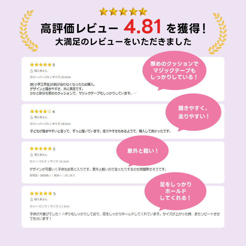 商品特徴 『もっと可愛く!もっと速く!女の子のスポーツシーンを足元から応援!』をコンセプトにガールズ向けに誕生した「ラブラッシュ バイ スーパースター」のキッズシューズです。「速く走る」を体現するために搭載されたパワーバネが走りをアシストします。重さは17.0cmで片足約100gです。【パワーバネ】ムーンスター独自開発の特殊なゴムを靴底に搭載し、地面を踏みこむときにパワーを蓄積し、蹴り出すと同時に一気にパワーを推進力に。【Ag+抗菌防臭】銀イオンの抗菌作用でにおいのもととなる菌の増殖を抑制し、防臭効果を発揮します。【洗えるインソール】インソールは取り出して洗えるのでいつも清潔に保てます。【耐摩耗ラバー】靴底にはすり減りが少なく、高い耐久性を発揮するラバーを採用しています。モヤ柄やシャカシャカパーツ、リボンをあしらったキュートなデザインです。胸がときめくようなモチーフがたくさん詰った、女の子らしさが光る一足です。運動会や体育の時間、クラブ活動等の走るシーンにおすすめです。 カラー マルチ、パープル、ピンク、ミント 足 幅 (ウィズ) 素 材 アッパー:合繊/合皮 ソール:EVA/ラバー 重 量 片足約100g(17.0cm時) 生産国 CHINA サイズ 子供靴 15.0cm 15.5cm 16.0cm 16.5cm 17.0cm 17.5cm 18.0cm 18.5cm 19.0cm 19.5cm 20.0cm 20.5cm 21.0cm 21.5cm 22.0cm 22.5cm 23.0cm こちらもおすすめ! こちらもおすすめ! 防水シリーズの新商品はこちら! スクールシューズ▼種類別タイプから選ぶ▼ ※写真の色と実際の商品の色は多少異なる場合がございます。※商品画像はメーカーサンプル品の画像です。 製品仕様・デザインは改良のため予告なく変更される場合があります。※ご注文画面にてご注文を確定後は、ご注文内容の取消・変更・追加を承ることができません。※2回以上に分けてご注文いただいた場合、同梱(ひとつの配送にまとめて出荷)対応を承ることができません。※他公式店舗間で在庫共有のため、同一商品を同時受注した場合にデータ到着までに在庫が欠品してしまうことがございます。 在庫欠品の際は在庫のある商品のみをお手配させていただきます。詳細はご利用ガイドの「商品在庫について」をご確認ください。以上の点をあらかじめご了承ください。※メーカー希望小売価格はメーカーカタログに基づいて掲載しています。