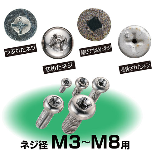 【用途】 つぶれたネジやなめたネジ等の取り外し作業。 【特徴】 つぶれたねじ、なめたネジ、錆びたネジ、固着ネジ、塗装されたネジなどのネジを簡単にはずすことが出来るビットです。 穴あけ、ネジはずしが同方向で行え、切替える手間が省けるだけでなく間違った回転方向で使用しネジやビットを傷めることもありません。 破損が多いネジ部は、ネジはずしに最適な先端角度でネジ山に食い込みやすく、耐久性も高いです。 ドリル部上にネジ部があり、軽傷のネジであれば差し変えすることなく、ビット片側のドリル部だけではずせます。 電動ドライバー用、色違いのリング付き、一目でサイズがわかります。 【仕様】 ●サイズ:直径6.35×82mm。 ●適用ネジ径:M3〜M4用・M5〜M6用・M6〜M8用×各1本。 ●外径(1本あたり):六角対辺6.35mm。 ●ドリル先端部:直径3.7・2.7・3.7mm×各1本。 ●ネジ先端部:直径1.7・2.6・3.6mm×各1本。 【材質】 ●ビット材。 ●ニトリルゴム。 【ブランド】 ベッセル 【メーカー名】 株式会社ベッセル 商品情報 メーカー名 株式会社ベッセル 名称 ネジはずしビット 3本組 サイズ 幅×高さ×奥行きmm・重量g 原産国 セット内容付属品 使用上のご注意