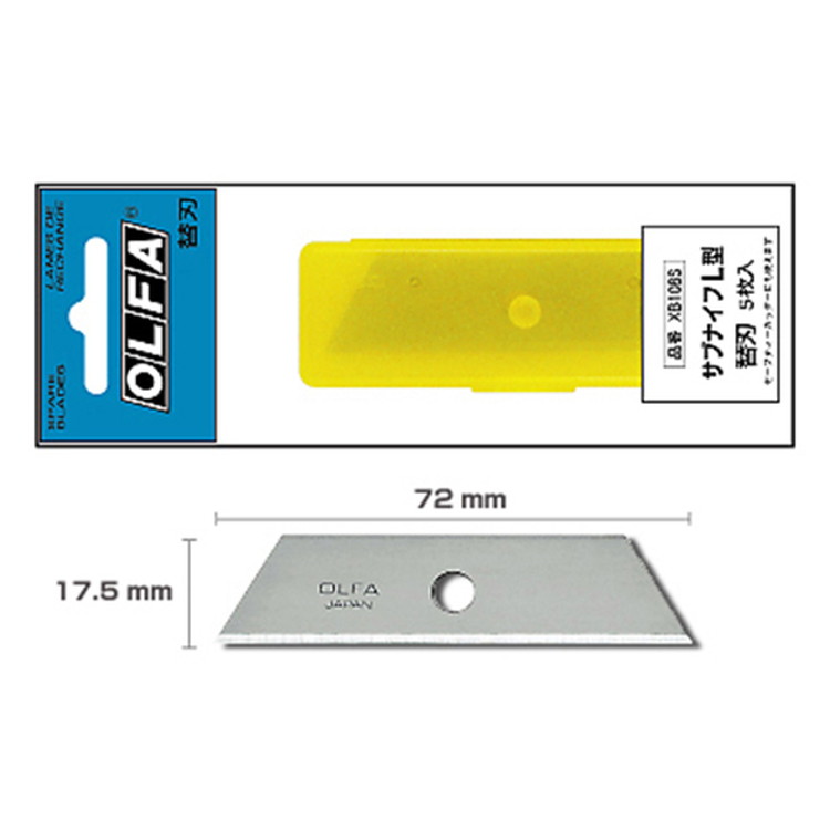 【用途】 サブナイフL型用替刃。 【特徴】 新サブナイフL型用5枚入替刃の10個セットです。 セーフティカッターにもご使用いただけます。 【仕様】 ●刃厚:0.6mm。 ●入数:5枚×10個。 ●適合本体:新サブナイフL型・セーフティカッター。 【材質】 ●合金工具鋼。 【ブランド】 オルファ 【メーカー名】 オルファ株式会社 商品情報 メーカー名 オルファ株式会社 名称 サブナイフL 替刃 小箱 サイズ 幅×高さ×奥行きmm・重量g 原産国 セット内容付属品 使用上のご注意 替刃の交換の際は十分にご注意ください。刃物ですから取り扱いに注意してください。幼児の手の届かないところに保管してください。