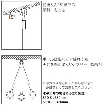 特 長 ★狭い場所でも使いやすいスポットタイプの軒天用物干し ★ポールの着脱が可能 ★前後左右15°までの傾斜にも対応 ★ポールは風などで揺れても天井を傷めにくいフリー可動設計 ★独自の内部構造で、ポールは揺れても抜け落ちません 仕 様 ★洗濯物目安重量:20kg(1本) ★長さ:SPO…655mm / SPOL…855mm ★木下地に対応した取付パーツ付属 材 質表面仕上げ ★ベース・ポール:ステンレス ★リング・ネジ:ステンレス ★樹脂パーツ他:ポリアセタール他 ★フック:ABS樹脂 ※こちらの商品はポールの長さ調整はできません。 手の届く高さは身長+30cmが目安となります。 ※竿の落下防止のため、市販の竿止めストッパーを必ずポールの外側に取り付けてください。 ※窓ガラスにぶつからないよう、距離をとって設置してください。 水平天井の場合で必要な距離:SPO-S:330mm / SPOL-S:400mm ※ステンレスは錆びにくい金属ですが、使用環境によってはサビが発生します。 その場合は市販の金属磨きなどでお手入れをしてください。 また、引渡し前のクリーニング時に洗浄液がかかりますと急速にサビが発生しますので 十分に養生してください。 (引渡しまでポールは外して室内に置き、本体を養生しておくことをおすすめします)