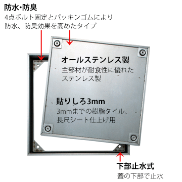 特 長 1.4点ボルト固定とパッキンゴムで、防水・防臭 2.耐食性に優れたステンレス枠、ステンレス目地 3.蓋の下部で止水 4.ボルト頭に引っかけて持ち上げる「引き上げハンドル」付き 仕 様 ★樹脂タイル用:貼りしろ3mmまでの樹脂タイル、長尺シート仕上げ用 ★適用荷重:歩行用 3.5Kn/m2 ★取手タイプ:ボルト ★鍵:簡易ロック ★内蓋・外枠・アンカー:SUS304 ★底板・蓋補強材:SUS430 ★パッキン:クロロプレンゴム ★ロックねじ:ステンレス 付属品 ★目地用スペーサー ★引き上げハンドル…六角レンチ(呼び6)の代わりにもなります ※ご注文頂く前に画像に記載されているサイズを必ずご参照、ご確認ください。