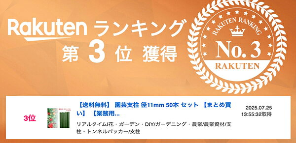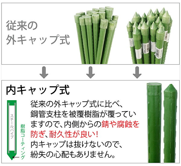 / おかげさまで 楽天ランキング3位 獲得! \ 【まとめ買い】たくさん使う方に、まとめ買いがお得です!【業務用】 《50本セット》 ■内キャップ式■ 従来の外キャップ式に比べ、鋼管支柱を被覆樹脂が覆っていますので、 内側からの錆や腐蝕を防ぎ、耐久性◎。 内キャップは抜けないので、紛失の心配もありません。 *植物、野菜などの支えに *整形・整枝に利用に *ネットなどの固定に ●全面に独特の突起がついており、誘引に便利。 突起は全体にありますので、どの高さでもつるが絡みやすく結束も容易です。 ●鋼管ポールを被覆樹脂が覆っているので、錆や腐蝕が内側からしにくくなります。 ●農薬・肥料に侵されにくい。 ●軽く、サイズが一定。取扱い・収納に便利。 ●竹のように前加工不要。 ●耐久性・作業性・経済性がイイ。 【直径】11mm ◎ 発送についての注意点 ◎ 沖縄県・離島・一部地域へのお届けは地域送料が加算されます。 その際にはメールにてお知らせしますので、ご注文内容・送料をご確認ください。 *他の商品と同梱発送不可の商品です。/ おかげさまで 楽天ランキング3位 獲得! \ 【まとめ買い】たくさん使う方に、まとめ買いがお得です!【業務用】 《50本セット》 ●内側からの錆や腐蝕を防ぎ、耐久性の良い『内キャップ式』。 ●全面に独特の突起がついており、誘引に便利。 ●農薬・肥料に侵されにくい。 ●軽く、サイズが一定。取扱い・収納に便利。 ●竹のように前加工不要。 ●耐久性・作業性・経済性がイイ。