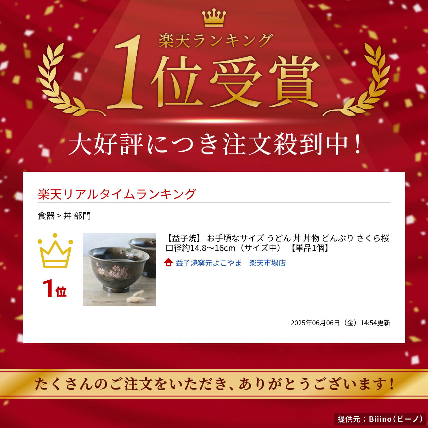 ■商品のご説明 益子焼窯元よこやまのさくら桜模様のうどん丼です。少し深さのある丼で、大きさはふだん使いに最適なお手頃なサイズ中のどんぶりです。カツ丼や天丼などの丼物にも最適。縁部分だけが広がっていて使いやすい形状です。重さも軽めに作られているのもポイントです。職人が絵付けした、さくら桜の模様です。外側正面と、内側にワンポイント絵付けが施されております。内側は、白化粧されております。素朴な風合いとなっております。小さな黒い点(鉄粉)が見られますが、このシリーズの特徴となりますのでご理解の上ご購入ください。 ■食器洗浄機○ 電子レンジ○ オーブン○ 直火× ※ご使用方法について ■【炭化焼シリーズ】 益子の粘土を使い、炭化焼という薪で燻す焼成方法で焼き上げられた、土の味わいを生かした陶器です。手に持ってみると土のぬくもりが伝わります。また表面は薄めに釉薬を掛けておりますので、熱の熱さが伝わりにくいのも魅力です。絵付けはひとつひとつ職人が絵付けしておりますので微妙に異なります。 当ネットショップの陶器は、焼き物の特性上、ひとつひとつ風合いが異なっております。色合い・大きさ・形などは、ひとつひとつ微妙に違いがございますのでご了承ください。また1ご注文で複数の個数をお買い物をいただきました場合には、在庫の中より出来る限り形や色合いなどをお揃えさせていただいておりますが、焼き物の特性上、上記の点をご理解くださいましてのご購入をお願い申し上げます。また買い足しでご購入いただきました場合は、お手元の物と形、サイズ、風合いが異なる場合がございます。 ■当店の商品は贈り物・ギフトなどにも大変喜ばれております 父の日、母の日、誕生日プレゼント、結婚祝い、結婚記念日、引き出物、内祝、敬老の日、御祝い、御礼、快気祝い、出産祝い、記念品、長寿の御祝い(還暦祝い、古希祝い、喜寿祝い、傘寿祝い、米寿祝い、卒寿祝い、白寿祝い。他に御法要の引き出物などにもご利用ください。) ギフト包装(無料)詳しくはこちらをご覧ください