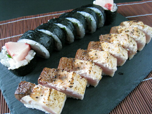 商品詳細 商品名 極み 寒鰤三昧セット(ブリ三昧セット) 原材料 鹿児島県産 鰤、岩塩、大葉、米、生姜、昆布、レモン、調味料(酢、砂糖、酒、塩、味醂、醤油、水あめ、ハチミツ、ダシ汁) 賞味期限 製造日(発送日)より3日間 ※商品到着に2日以上かかる地域への発送は出来ません。商品到着後は出来るだけお早めにお召しあがり下さい。 内容量 特選岩塩炙り寒鰤箱寿司 1本8カン(8切れ)/特選寒ブリ太巻き寿司 1本(太巻きサイズ)/寒ぶり昆布シメ 約100g 3点セット お召し上がり方 冷蔵状態ですと酢飯が硬くなっていますので、60分〜90分かけて常温に戻して頂くか、電子レンジで10〜20秒ほど少し温めてからお召しあがり下さい。冷え過ぎたシャリは元に戻らない場合がありますので、冷やし過ぎにご注意して下さい。 ご注意 冷え過ぎるとシャリがパサパサになってしまいますので、涼しい場所で保管して下さい。冷蔵庫なら、野菜室など冷え過ぎない場所に保管して下さい。 お届け・送料等 送料 料金表⇒こちら お届け方法 冷蔵便(ヤマト運輸) 配達日・時間指定 発送日は4日後以降からのご指定でお願いします。※当店からのメールで到着日をご確認下さい。時間指定については、地域によりご指定時間に配達出来ない場合があります。(注文後メールにてお知らせいたします)ページ下部の発送目安表をご覧下さい。 ※北海道・北東北・沖縄県(一部離島)は、送料無料の場合でも別途送料660円かかります。-極み 特選 寒鰤三昧 セット- 寒ブリを使った、特選オリジナル三点セット作りました。 店長考案!! 店長一押し!! ■極厚!! 岩塩炙り寒ブリ箱寿司 ■極太!! 寒ブリ太巻き寿司 ■極艶!! 寒ブリ昆布〆 極み特選 寒鰤三昧/特選 寒ブリ3点セット ◆極みシリーズ◆ 仕出し米長流!鰤尽くし!寒鰤三昧!冬季限定、ブリを堪能出来る様に、お得なセットにしました。先ずは、得意の箱寿司。極厚に切った身に、岩塩をふりバーナーで炙りました。レア状態でお届けします。次は、太巻き寿司!これもまた得意の極太巻きになっております。大葉で香り付けをし、分厚い巻き寿司をほおばってくださいね!最後は、昆布〆!脂の乗った鰤を贅沢に昆布シメにしました。昆布の旨味を封じ込めた絶品です。今年の冬はこれで決まりですね! 発送(梱包)状態は、折り箱に包み、そのままでも贈答用や贈り物にも使えます。大切なお方にも是非、お送り下さい※ギフト用の包装紙はご用意出来ます。備考欄にお書き下さい。産直、兵庫県明石市より、全国発送・地方発送でお送り致します。お取り寄せ お取り寄せグルメ などにお使い出来ます。