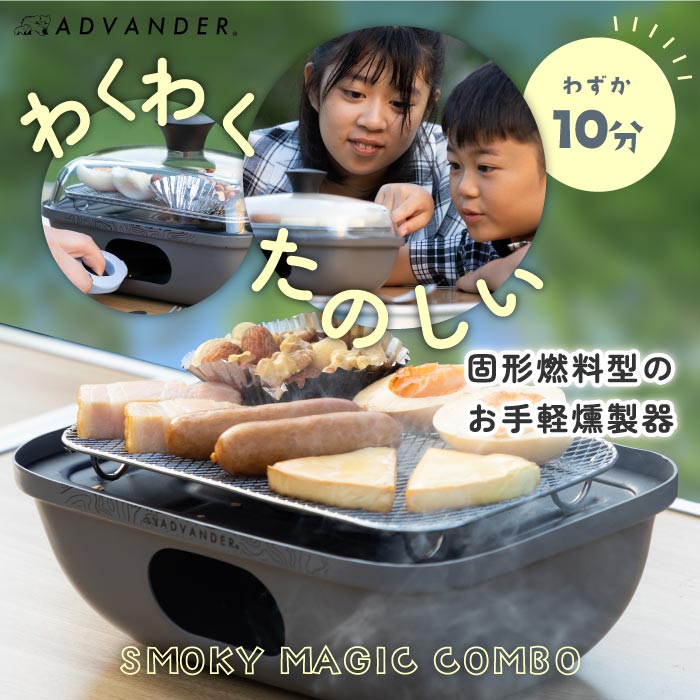 燻製器 家庭用 アウトドア 【選べる特典付】 ADVENDER SMOKY MAGIC COMBO 簡易燻製器 簡単 燻製 スモーク ガラス蓋 見える 楽しい キッズ 子供 親子 ビギナー 初心者 BBQ キャンプ バーベキュー ベランピング ウッドチップ5種 桜 松 胡桃 栗 楢 バッグ ケース付き 調理器具