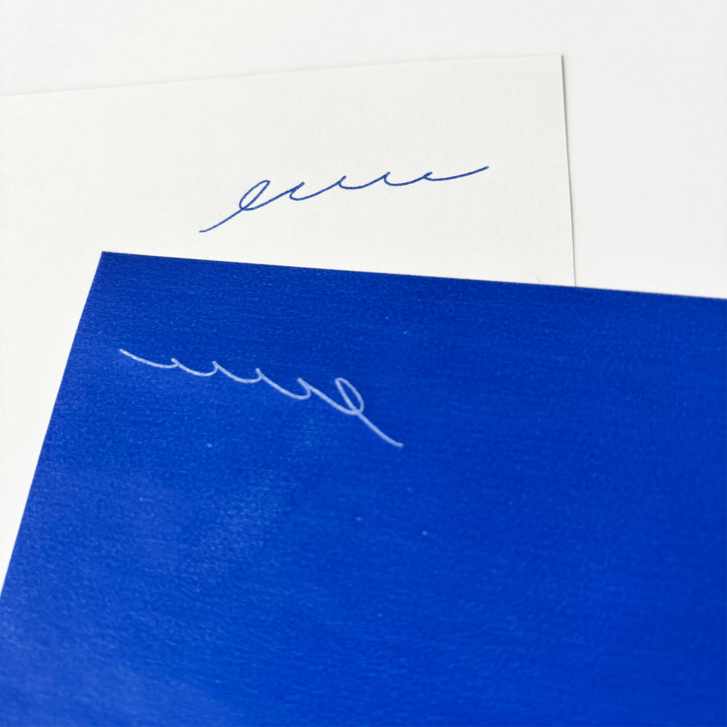 昔懐かしい、表面が白色 裏面がブルーの裏カーボン紙です。 白い面に文字やイラスト、図を書くと、筆圧で裏面のカーボンが下に敷いた紙などに転写される仕組みです。 文房具として、趣味の道具として使いやすいよう、10サイズをご用意しました。 ※1回使用の使い捨てタイプです。 ※転写先の素材によっては、うまく転写できない場合もございます。 ※商品写真はできる限り実物の色に近づけるようにしておりますが、 お使いのモニター設定、お部屋の照明等により実際の商品と色味が異なる場合がございます。 ※全判(788×1091)の場合、紙の上下にインクが付いていない「耳」の部分がございます(画像参照)。5枚、10枚の場合は巻いて出荷いたします。それ以上は平の状態で出荷いたします。