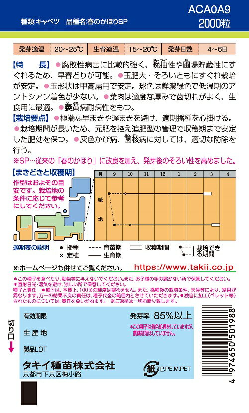 注)こちらの商品は野菜の種子です。 注)新種待ち、メーカー在庫キレ等によりご注文を キャンセルまた多少お時間頂く場合がございますので誠に恐れ入りますが、あらかじめご了承頂きますようよろしくお願い致します。納期につきましてのお問い合わせはお気軽にお申し付けください。 注)まき時期をご確認の上、ご注文をお願い致します。 ☆特長☆ ●早春どり可能、栽培しやすい良質系 本種は早春どり可能な良質系としては、腐敗性病害に比較的強く、晩抽性や圃場貯蔵性にもすぐれる。上昇気温下となる早春どりでも収量があがる。 ●肥大とそろいともにすぐれる 外葉は大型で玉肥大がよいが、草姿は中立性なので、そろいよく生育する。 ●品質にすぐれる 玉の形状は甲高扁円形に安定し、球色は鮮濃緑色で低温期のアントシアン着色が少ない。葉肉は適度な厚みで歯切れがよく、生食用に最適。 ●萎黄病耐病性 萎黄病に対し耐病性をもつので、安心して栽培できる。 ※SP…従来の「春のかほり」に改良を加え、発芽後のそろい性を高めました。