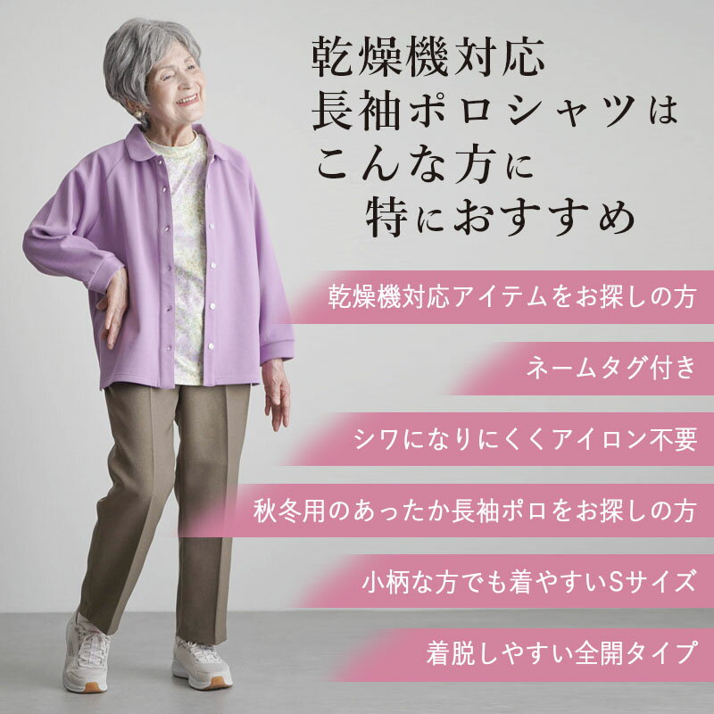 商品詳細秋冬仕様のありそうでなかった前開き裏起毛長袖ポロシャツ。裏起毛がほんのり暖かく柔らかいので着心地抜群。日常使いにもぴったりです。 ●しっかりした襟元で、アイロンが不要。いつでもキチンとした印象を保てます。 ●程よい厚みの裏起毛生地なので1枚で着用してもあたたかさを実感頂けます。洗濯機と乾燥機に対応し、日々のお手入れが簡単。 ●ラグラン袖で肩周りの動きやすさを確保。特に腕が上がりにくい方にも快適にご利用いただけるデザインです。 ●レディースはS・M-L・LLのサイズ展開。小柄な方にもフィットするSサイズをご用意しています。 ●斜めのボタンホールと大きめのボタンで着脱が容易。袖口が短めなので袖口がもたつかず名前が書けるタグも付いているので、介護施設でも大変好評です。 ●襟と身頃が同じ生地で仕上げられており、洗練された見た目。袖口がリブでないので引っ掛かりにくく、脇スリット入りでお腹周りをスッキリ見せます。(素材)ポリエステル85% 綿15% ※裏起毛加工を施しているため裏側が毛羽立ち・毛玉のように見える場合がございますが不良ではございません。(サイズ展開)S・M-L・LL(カラー展開)薄ピンク・パープル(生産国)中国製70代80代の方のためのおしゃれなシニアファッション(ハイミセス向け)の洋服を多数取り揃えています。高齢になると体型の変化で今まで着ていたお洋服のサイズが変わったり、着替えがしにくくなったりと「洋服を着る」「お洒落を楽しむ」にもちょっとした不便なことも多くなります。シニアファッションを綺麗な着姿でおしゃれを楽しめるように、大きなサイズから小さなサイズまで取り揃えています。70代80代の方に向けたオリジナルシニアファッションブランド「ココわく」をはじめ、いくつになってもおしゃれを楽しみ元気でお出掛けしたくなるお洋服を提案してまいります。おしゃれをすると気分も明るくなりますね。着替える。身なりを整えるという日常の動作はお年寄りの寝たきり防止の為にも大切です。毎日おしゃれを楽しんでいつまでも元気なおじいちゃん、おばあちゃんが増えるように素敵な洋服をご紹介していきます。また、母の日・父の日・敬老の日やお誕生日祝い、還暦・喜寿・米寿・傘寿・白寿のお祝いの際にもプレゼントギフトラッピングをさせていただきますので是非ご利用くださいませ。■こんなキーワードで検索されていますシニアファッション(60代 70代 80代 90代) 服 高齢者 お年寄り 老人 洋服 シニア服 ファッションおばあちゃん 祖母 母 義理 の お母さん 義母 女性 レディース 妻 婦人 婦人服プレゼント ギフト 贈り物 誕生日 誕生日プレゼント 母の日 敬老の日 還暦祝い 古希 喜寿 傘寿 米寿 卒寿 白寿 百寿 長寿お祝い 内祝い両親 金婚式 銀婚式 祖父母 内祝 お返し 出産 快気祝い クリスマスプレゼント お見舞お洒落 おしゃれ オシャレ 上品 高級 上質 おすすめ 人気 かっこいい 着心地がいい 旅行用 デイサービス お出かけ 送料無料 ラッピング 包装 即日発送