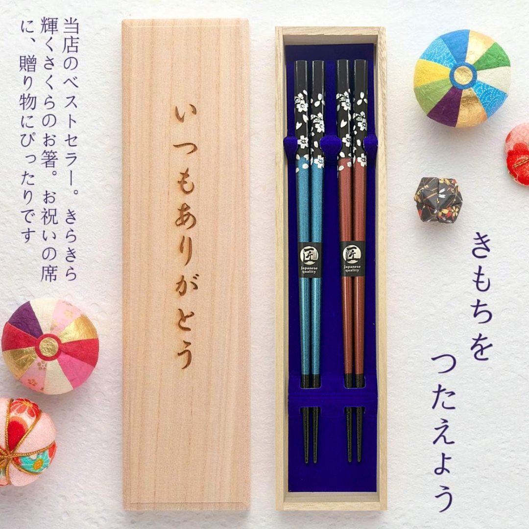 もらって嬉しい!結婚祝いに人気の名入れ夫婦箸10選 八角さくら 桐箱入り夫婦箸(二膳セット)名入れ無料 八角形で末広がりの箸は縁起が良く、結婚祝いに最適です。 八角煌河 桐箱入り夫婦箸(二膳セット)名入れ無料 まるで天の川のような煌めき。鉄木を使用した高級八角箸。 一双瑞雲 桐箱入り夫婦箸(二膳セット)名入れ無料 伝統の若狭塗箸。金箔をあしらったとても美しいお箸です。 一双田園 桐箱入り夫婦箸(二膳セット)名入れ無料 若狭塗の最上級ブランド一双のお箸。結婚祝いに最適です。 一双祝い桜 桐箱入り夫婦箸(二膳セット)名入れ無料 ふたりの新しい門出を祝う贈り物として最適な夫婦箸です。 ハッピーハート 桐箱入り夫婦箸(二膳セット)名入れ無料 ハートが沢山!幸せいっぱいのおふたりのようなお箸です。 ドールキャット 桐箱入り夫婦箸(二膳セット)名入れ無料 ねこ好きなおふたりに、ねこの箸。結婚祝いとしても人気。 天宝和うさぎ 桐箱入り夫婦箸(二膳セット)名入れ無料 うさぎは縁結び子孫繁栄の象徴。結婚祝いにぴったりです。 あわび貝おぼろ月夜 桐箱入り夫婦箸(二膳セット)名入れ無料 お月様とうさぎに模られたあわび貝の装飾。女性用は赤色。商品名・読み 桐箱付き夫婦箸 銀桜花(きりばこつき めおとばし ぎんおうか) 商品説明 1978年(昭和53年)に伝統工芸品に指定された福井県小浜市で生産される漆器 若狭塗箸です。 塗箸は全国シェアーの80%以上を占めていて、米国第44代大統領バラク・オバマを含め多くの著名人に箸が贈呈されています。 「銀桜花」のカラーは緑・紫・赤・金・青の5種類です。 その名の通り、キラキラ光る銀の桜が描かれております。また、お箸の色も「緑は紫」「紫は橙」と見る角度により色が変化します! 滑り止め加工なので、使いやすい事間違いなしのお箸です♪夫婦箸(二膳セット)です。 バリエーション 緑・紫・赤・金・青 サイズ 長さ:22.5cm 素材 天然木 箸先 丸・すべり止めつき 製造国 日本(福井県小浜市) 付属品 ●二膳用の桐箱が付属します。 名入れ レーザー彫刻機にて彫り込み、緑・紫・赤・青は金色の塗料を埋め込みます。 ※金色のお箸のみ、彫ったままの黒めに焦げた状態で名入れ致します。 ●名入れ可能字体:ひらがな、カタカナ、漢字、アルファベット(横書き)。 ●名入れをご希望の場合は、備考欄にご希望の名前をご記入下さい。 ご注意 ●銀行振込・郵便振替の場合、入金確認後の発送です。 ●モニターにより、色の見え方が実際の商品と異なることがございます。 ●注文が集中した場合など、発送が遅れたり、在庫切れで販売できなくなる可能性がございます。 ●桐箱は性質の都合により、微細な木の粉が生じる場合がございます。 【天然素材の箸について】 木の個体差などにより、左右の色合いや文字色の濃さなどに差が生じる場合がございます。予めご了承下さい。 【箸の取扱いについて】 長時間の浸水は変形・変色の原因となり、木をいためますのでお避けください。 【一部の絵柄付きのお箸について】 長時間の浸水により成分の都合で絵柄部分が白くなる事がございますが、時間が経てば元に戻ります。