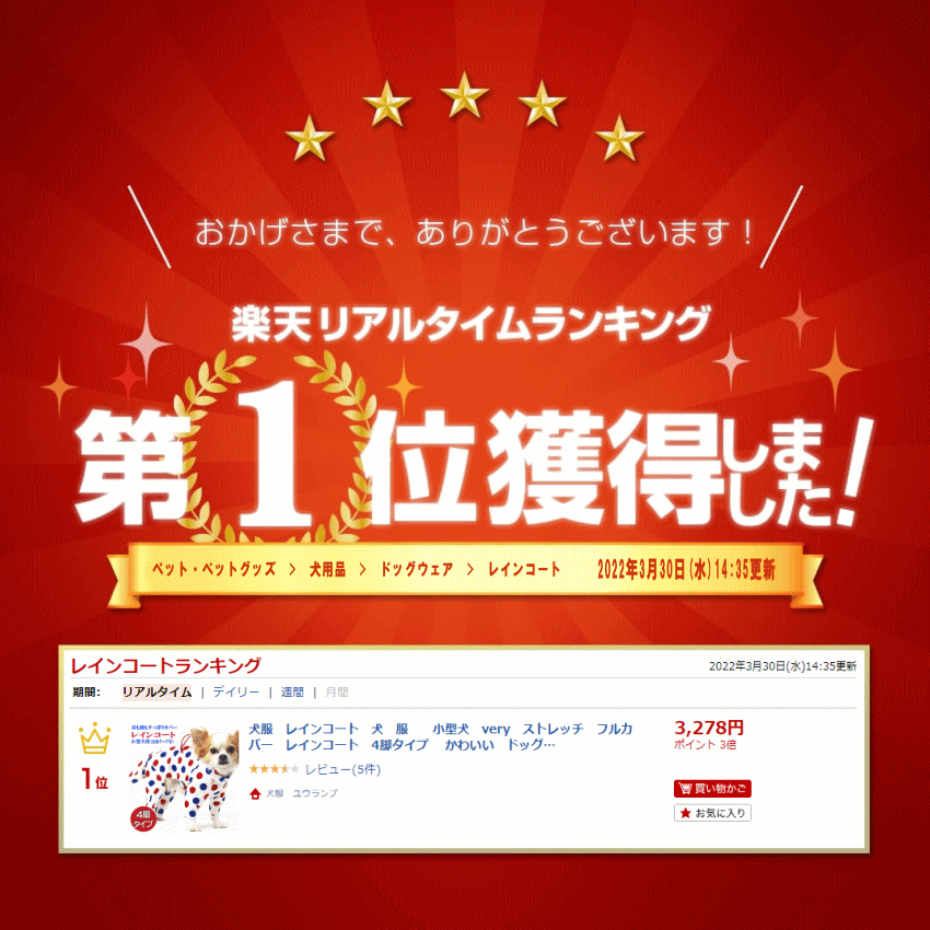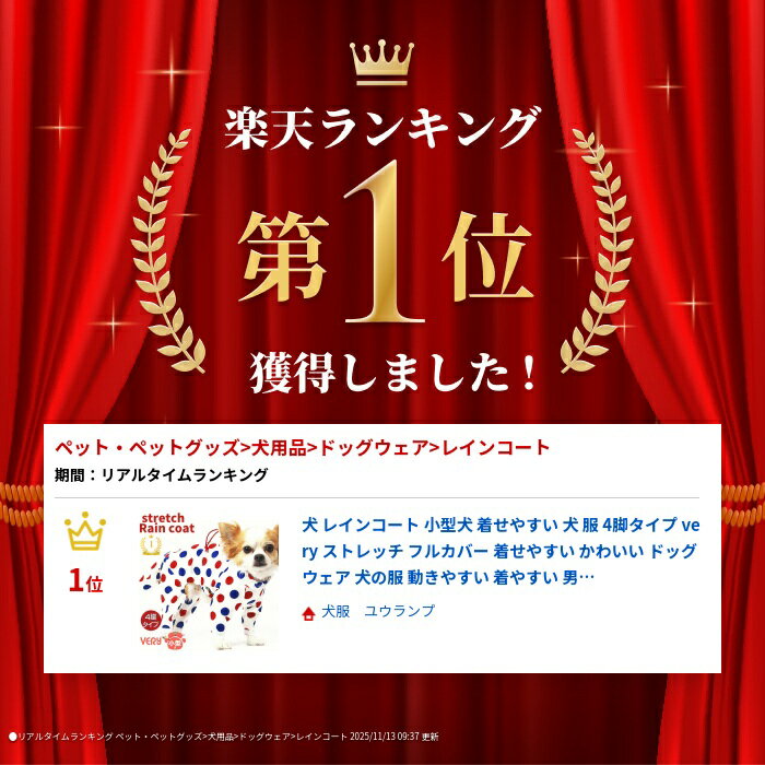 犬 レインコート 小型犬 着せやすい 犬 服 4脚タイプ very ストレッチ フルカバー 着せやすい ランキング1位 かわいい ドッグウェア 犬の服 動きやすい 着やすい 男の子 女の子 かわいい おしゃれ 犬 雨 散歩 プレゼント グッズ ユウランプ アウター 雨の日のお散歩や梅雨時期に最適! 雨から全身をカバーできるストレッチフルカバーレインコートです。素材ポリエステル80%、ポリウレタン20%雨の日もオシャレに! 大型犬の快適な散歩をサポートする、4脚タイプのストレッチレインコートです。特徴抜群のストレッチ性: どんな動きにもフィットするストレッチ素材で、愛犬のストレスを軽減。フルカバーで全天候対応: 体全体を覆うので雨風からしっかりガード。泥汚れも防ぎます。簡単装着: 着せやすく脱がせやすい設計で、お出かけ前の時間短縮に。豊富なデザイン: おしゃれなデザインが豊富なので、愛犬の個性を引き立てます。高品質素材: 防水性・耐久性に優れた素材を使用。長く愛用できます。こんなワンちゃんにおすすめ雨の日のお散歩が大好きなワンちゃん泥んこ遊びが大好きなワンちゃんおしゃれに着せたいワンちゃんご使用方法レインコートを広げ、愛犬の頭を穴に通します。前足、後足を通し、胴体部分を調整します。しっかりと固定したら完成です。ご注意事項サイズは必ず実寸をご確認の上、お選びください。雨上がりにはすぐに拭き取り、乾燥させてください。愛犬との楽しいお散歩を、このレインコートでさらに快適に!※通販便のご利用をお願い致します。 予めご了承の程お願い申し上げます。【注意事項】※布地破れ・傷など発見された場合は、事故防止の為ご使用を中止して下さい。※ワンちゃんの誤飲防止のためにも飼主様の管理の元ご使用下さい。誤飲等の事故については責任を負いかねます。※万が一ワンちゃんが噛んだ場合はすみやかに口の中を洗浄し、飲み込んだ場合は獣医の診断を受けて指示に従って下さい。あらかじめご了承のほど、よろしくお願い申し上げます。適応犬種 トイプードル シーズー キャバリア ヨークシャテリア マルチーズ パピヨン ミニチュアダックスフンド フレンチブルドッグ パグ チワワ 2