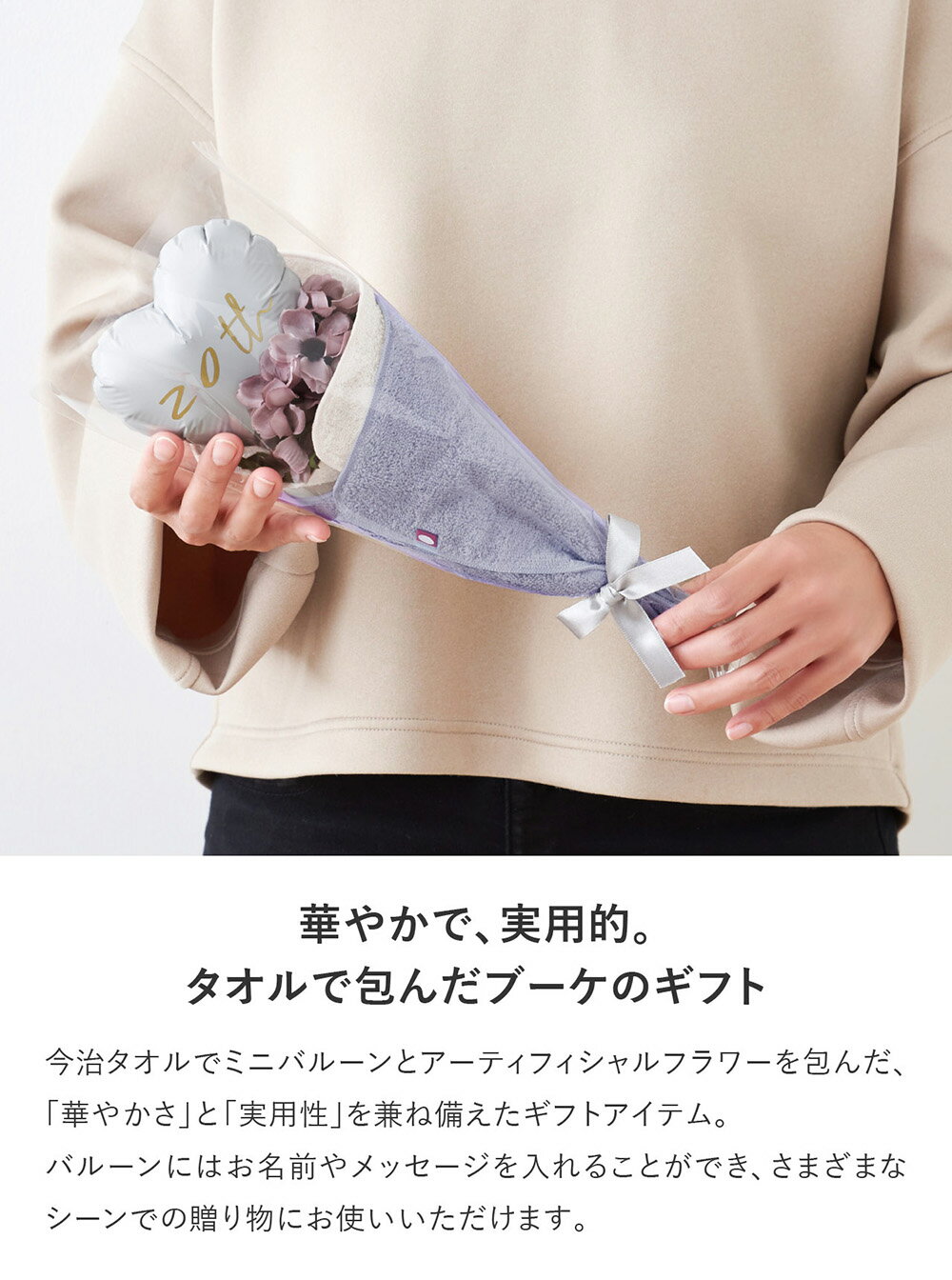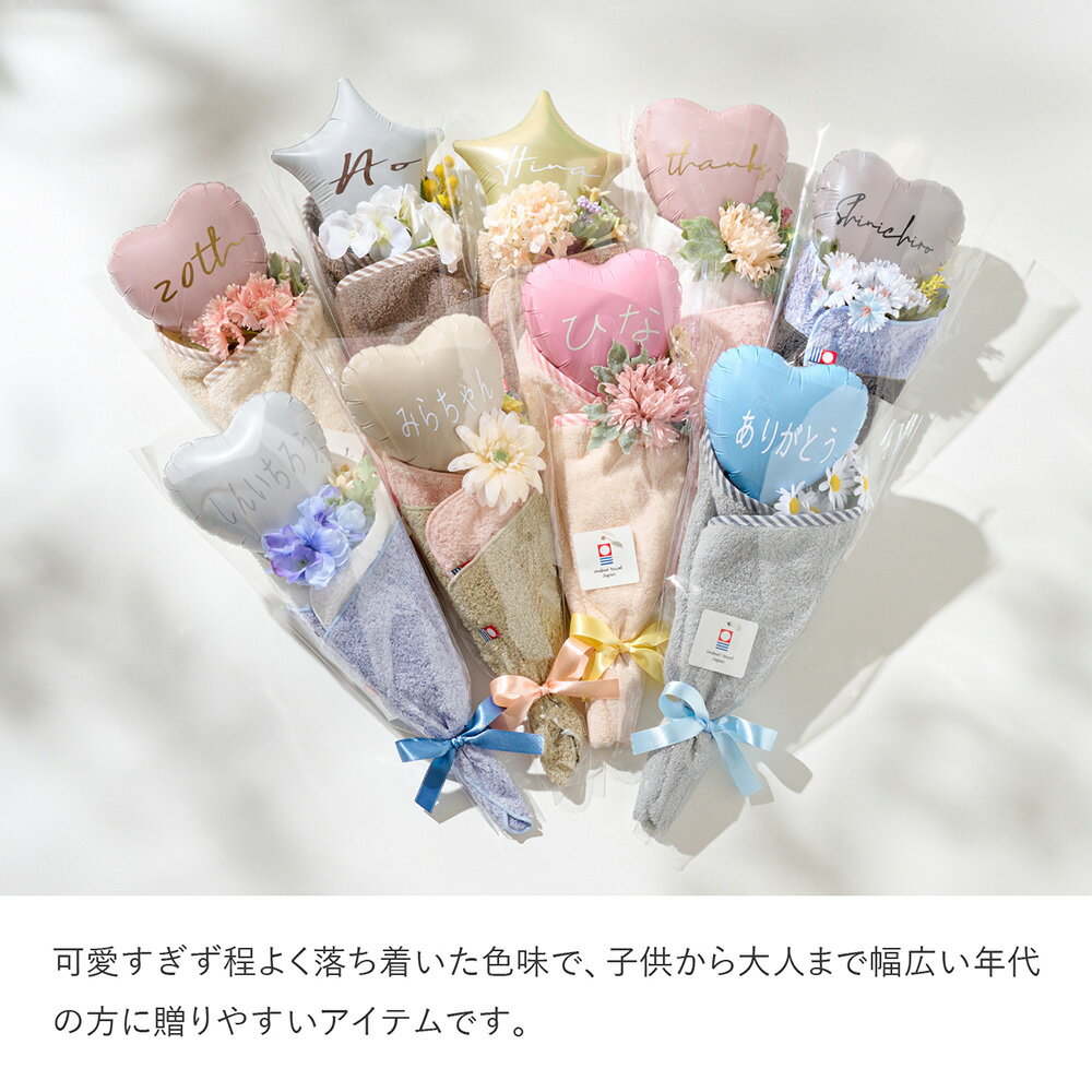 商品名 regalo プチバルーンブーケ 今治タオル 特長 華やかで、実用的。タオルで包んだブーケのギフト 今治タオルでミニバルーンとアーティフィシャルフラワーを包んだ、「華やかさ」と「実用性」を兼ね備えたギフトアイテム。 バルーンにはお名前やメッセージを入れることができ、さまざまなシーンでの贈り物にお使いいただけます。 ブーケを包むタオルには、品質にこだわった今治タオルを採用。 ブランドの厳しい検査基準をクリアした抜群の吸水性と、やわらかな肌触りで、使うたびに品質の高さを実感していただけます。 (認定番号:第2022-1140号/第2009-1407号) ●ご利用シーンの例 入園/入学/卒園/卒業/発表会/誕生日/成人祝い/七五三/就職祝い/退職/母の日/父の日 セット内容 ◆今治タオル ・ループタオル ×1  または ・ハンカチタオル ×2 ◆バルーン ×1 ◆アーティフィシャルフラワー ※フラワーとラッピングの種類・カラーはおまかせとなります。 バリエーション 【選べる】今治タオル:全9種 ループタオル_ナチュラル/ループタオル_ピンク/ループタオル_ブラウン/ループタオル_グレー/ハンカチタオル_ブルー /ハンカチタオル_ピンク /ハンカチタオル_ベージュ/ ハンカチタオル_チャコール 【選べる】バルーン:全14種 H_ホワイト/H_パールアイボリー/H_サルファーイエロー/H_ミルキーピンク/H_アンバーローズ/H_ベビーブルー/H_シャドウブルー/H_アイビー/H_エクリュベージュ/H_グレー/H_ミルキーラベンダー/S_ホワイト/S_パールアイボリー/S_サルファーイエロー サイズ ◆本体:約 縦36×横15cm ◆ループタオル:約 縦32×横32cm ◆ハンカチタオル:約 縦20×横20cm ◆バルーン:約 13cm 素材 ◆ループタオル・ハンカチタオル:綿100% ◆バルーン:アルミ蒸着フィルム 生産国 ◆ループタオル・ハンカチタオル:日本製(今治産) ◆バルーン:日本製 【無料】バルーンへの文字入れについて お名前やメッセージなど、ご希望の文字(10文字以内)をお入れします。ご注文時、入力欄にご希望の内容をご入力ください。 ※「!」「?」「&」以外の記号不可。 ※数字を含めたご指定も可能です。数字のみの場合は英数字フォントとなります。 ※ご指定いただいた文字数が多めの場合は、文字のサイズを小さくしたり、文字の横幅を狭めてレイアウトを調整いたします。 ※文字の配置バランスはスタッフのおまかせとなります。 ※制限以上の文字数は対応できかねますので、あらかじめご了承ください。 ※ご不明な点がございましたら、お電話またはメールにてお問い合わせください。 注意事項 あらかじめ下記内容をご了承のうえ、ご購入いただきますようお願い申し上げます。 ※入荷時期によって、製品の仕様・形状が一部変更になる可能性があります。 ※撮影時の照明や、ご覧のモニターなどにより、色味が若干異なる場合があります。 ※サイズ表記は実際の計測値です。製品によって多少の個体差があり誤差が出る場合がございますので、参考サイズとしてご覧ください。 フラワー 花 ギフト メッセージ 風船 贈り物 実用的 華やか シンプル お祝い 記念日 七五三 成人祝い 就職 母の日 父の日 敬老の日 パーティー アーティフィシャルフラワー アレンジメント 実用性 ハート スター 星 ピンク ブラウン グレー ベージュ ブルー パープル ゴールド regalo regaro レガーロ レガロ ユープラス▼おすすめ関連商品▼