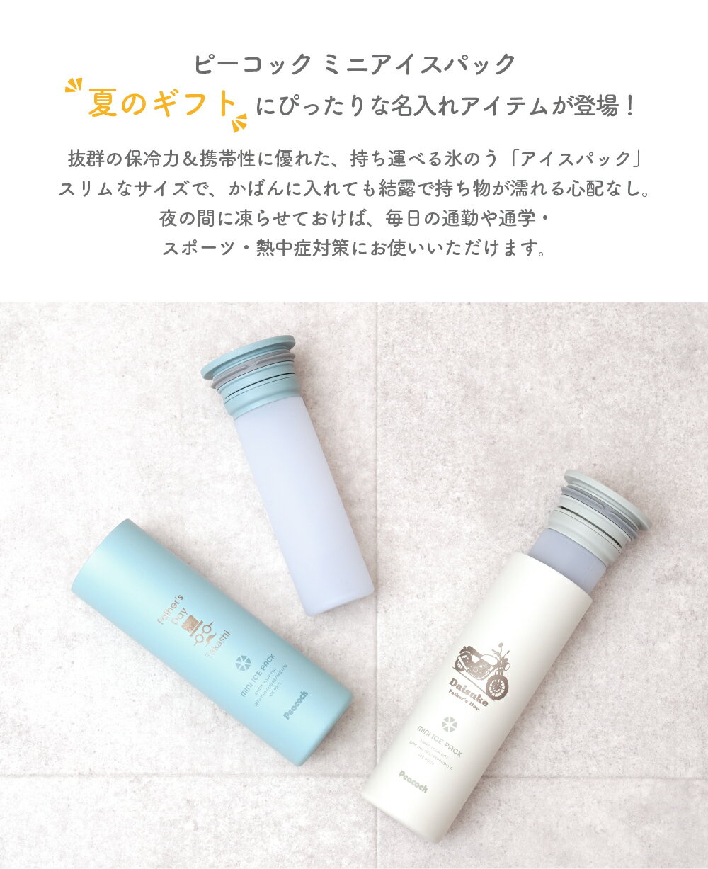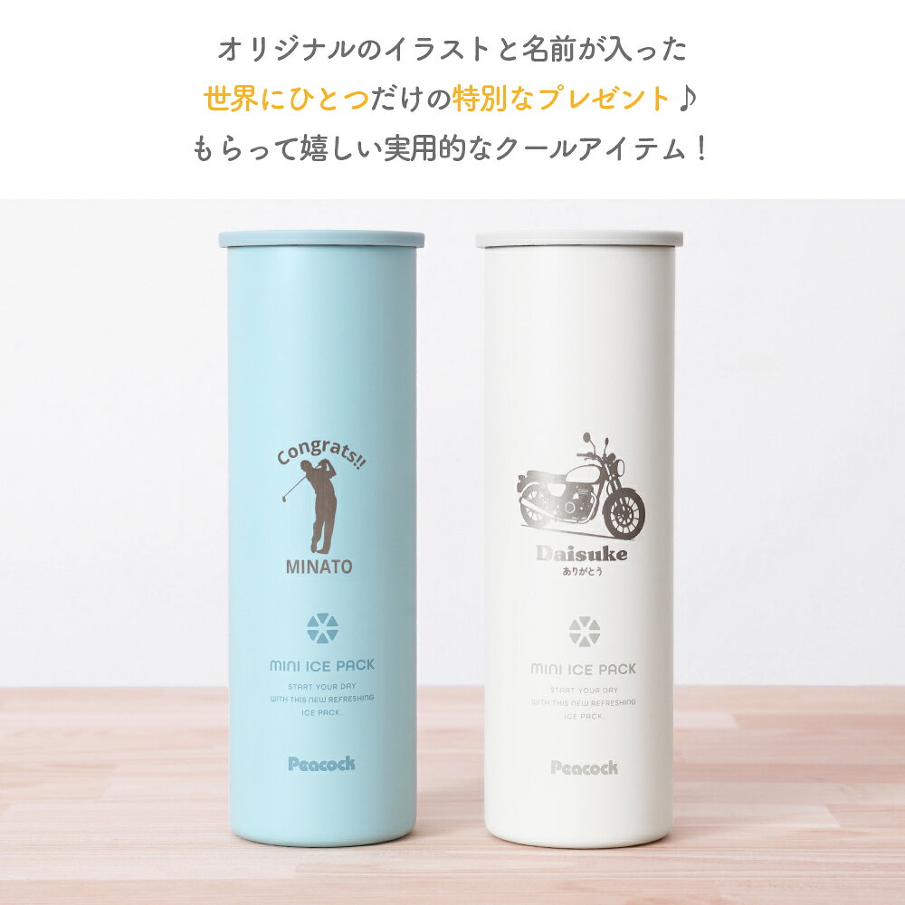 商品名 regalo 【名入れ】ミニアイスパック ギフトシリーズ 特長 お名前やメッセージを刻んで、世界にひとつだけのギフトを贈れます 暑い季節の強い味方「Peacockのミニアイスパック」に、オリジナルデザイン&名入れサービスが登場! おしゃれなデザイン柄とともに、お名前やフレーズメッセージを刻印できます。実用性とデザイン性を兼ね備えた、夏におすすめの名入れギフトアイテムです。 【Peacock】ミニアイスパック 真空断熱構造でひんやり感を長時間キープしてくれる、Peacock(ピーコック)のミニアイスパック。繰り返し使える保冷アイテムとして、熱中症対策や発熱時の冷却、アウトドア・スポーツ後のクールダウンなど幅広く活躍。結露しにくく、バッグの中も快適に保ちます。 サイズ(約) ◆ラッピング状態:約 幅10×高さ26cm ◆本体:約 φ5.8×高さ17cm ◆氷のう口径:約 2.4cm ◆本体重さ:約 200g ◆容量:約 150ml ◆刻印サイズ:約4×4cm以内 ※デザインにより異なる 素材 ◆胴部:ステンレス(アクリル樹脂塗装) ◆氷のう本体:シリコーンゴム ◆キャップ:ポリプロピレン ◆パッキン:シリコーンゴム お手入れ方法 ●ご使用後は、 必ずその日のうちにお手入れをお願いします。 ●お手入れをするときは、やわらかいスポンジ以外は使用しないでください。 ●においを防ぐため、こまめにお手入れください。 【シリコーン氷のう】 使用後は中身を捨て、 十分乾燥させてからキャップをしめ、 乾燥した場所で保管する。 表面の汚れがひどい場合は、中性洗剤を使用して手洗いする。 【キャップ・内ぶた・冷たさキープホルダー】 スポンジに中性洗剤を含ませ、きれいに洗い、ぬるま湯か水で丸洗いし、 すぐに乾いた布で水分をふきとり十分に乾燥させる。 【パッキン】 パッキンをキャップから取りはずし、 ぬるま湯か水で丸洗いし、乾いた布で水分をふきとる。 その後、キャップに確実に取りつける。 (パッキン表面にゴミなど付着していると、水もれの原因) 注意事項 あらかじめ下記内容をご了承のうえ、ご購入いただきますようお願い申し上げます。 ・氷のう以外の目的で使用しないでください。 ・沸騰消毒、食器洗浄機、食器乾燥機、塩素系漂白剤、金属タワシ、クレンザー、シンナーベンジンは使用不可。 ・本体はつけ置き洗いはしないでください。 ・本製品は密閉製品ではありません。 ・氷を入れる際は無理に押し込まず、角の尖った氷は入れないでください。 ・横にしたり逆さにした状態で凍らせないでください。 ・水または氷以外のもの(お湯等)を入れないで下さい。 ・バックなどに入れるときは縦にして置いてください。 ・シリコーン氷のう及び、キャップの表面は結露する場合があります。 ・水や氷を入れた状態で放置しないでください。 血行障害や凍傷、負傷事故を防ぐために、次のような使い方はしないでください。 ・就寝時の使用 ・長時間、同一部位の冷却 ・妊娠中または妊娠していると思われる場合 ・シリコーン氷のうに摩擦、損傷のある場合 名入れ オリジナル ギフト ピーコック ミニアイスパック 150ml プレゼント 贈り物 ラッピング無料 送料無料 おしゃれ シンプル コンパクト スリム 軽量 小型 持ち運び 携帯用 冷却グッズ 冷感アイテム 保冷グッズ 冷却パック 保冷剤 アイスパック 氷のう 真空断熱 ステンレス シリコン製 父の日 母の日 敬老の日 誕生日プレゼント 還暦祝い 退職祝い 実用的ギフト 暑さ対策 熱中症対策 夏ギフト 夏の贈り物 屋外作業 スポーツ観戦 アウトドア ゴルフ 部活 通勤 通学 キャンプ 運動会 レジャー 男性向け 女性向け メンズ レディース お父さん 祖父 50代 60代 高齢者 学生 子供 小学生 中学生 高校生 人気商品 regalo ユープラス▼おすすめ関連商品▼