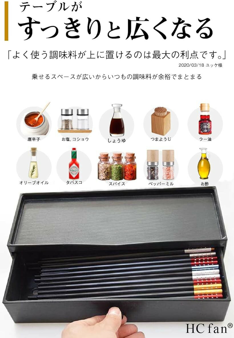 バリエーションコード : 2b4ippiddo商品コード2b4h454l1x商品名テーブル すっきり 片付く 箸入れ グリップゴム/静音クッション採用 4個セット 調味料 つまようじ 置ける 清潔 衛生 業務用 引出し 箸箱ブランドHC fanカラー4個・v調味料やつまようじなどが置ける、カスターと一体になった機能的な箸箱です。もう少し広く使いたいご家庭のダイニングテーブル、雑誌やTVで取り上げられた人気ラーメン店、お昼時に忙しい定食屋、居酒屋、お箸がたくさん入るから中規模から大規模の社員食堂、セルフスタイルにちょうどいいテーブルにいつも置ける学生食堂などの、お店や大人数のご家庭など、カトラリーケースとしておすすめ。・・v「サイズ」箱外:幅 29.0 cm 奥行 10.5 cm 高さ 8.5 cm 箱内:幅 27.3 cm 奥行 9.0 cm 一般的な長さの箸は男性用 23cm 、女性用 21cm なので、十分に余裕を持って出し入れできます。中華料理用の長い27cm の箸も入ります。袋入りの割りばしを入れておけば、お箸を洗ったり、用意する時間が節約できます。・・v「色 ・材質」 どんな場所にも合うマットブラック ・ 軽さと丈夫さを兼ねそろえたABS樹脂を採用。これまでの箸立てでは、気が付かないホコリや油汚れが大切なお箸に付いてしまいます。引き出しタイプの箸箱を置けば、清潔なお箸を気持ちよくご使用いただけます。箸箱の底には湿気を考慮した通気穴があり、洗った後の余分な水気を切った箸を片付けても、湿気を逃がして乾燥します。忙しい毎日の食器洗いを少しでもラクになります。・・v箸箱を2つ重ねることで、上段は箸入れとして、下段はスプーンやフォーク、レンゲ入れとして使えます。食事の準備が出来て食べる時に、箸やスプーンの準備が不要になって、ストレスフリーになります。*画像の箸は使用イメージです。付属は致しません。※ 他ネットショップでも併売しているため、ご注文後に在庫切れとなる場合があります。予めご了承ください。※ 品薄または希少等の理由により、参考価格よりも高い価格で販売されている場合があります。ご注文の際には必ず販売価格をご確認ください。※ 沖縄県、離島または一部地域の場合、別途送料の負担をお願いする場合があります。予めご了承ください。※ お使いのモニタにより写真の色が実際の商品の色と異なる場合や、イメージに差異が生じることがあります。予めご了承ください。※ 商品の詳細(カラー・数量・サイズ 等)については、ページ内の商品説明をご確認のうえ、ご注文ください。※ モバイル版・スマホ版ページでは、お使いの端末によっては一部の情報が表示されないことがあります。すべての記載情報をご確認するには、PC版ページをご覧ください。色:4個v調味料やつまようじなどが置ける、カスターと一体になった機能的な箸箱です。もう少し広く使いたいご家庭のダイニングテーブル、雑誌やTVで取り上げられた人気ラーメン店、お昼時に忙しい定食屋、居酒屋、お箸がたくさん入るから中規模から大規模の社員食堂、セルフスタイルにちょうどいいテーブルにいつも置ける学生食堂などの、お店や大人数のご家庭などにおすすめ。v「サイズ」箱外:幅29.0cm奥行10.5cm高さ8.5cm 箱内:幅27.3cm奥行9.0cm一般的な長さの箸は男性用23cm、女性用21cmなので、十分に余裕を持って出し入れできます。中華料理用の長い27cmの箸も入ります。袋入りの割りばしを入れておけば、お箸を洗ったり、用意する時間が節約できます。v「色・材質」どんな場所にも合うマットブラック・軽さと丈夫さを兼ねそろえたABS樹脂を採用。これまでの箸立てでは、気が付かないホコリや油汚れが大切なお箸に付いてしまいます。引き出しタイプの箸箱を置けば、清潔なお箸を気持ちよくご使用いただけます。箸箱の底には湿気を考慮した通気穴があり、洗った後の余分な水気を切った箸を片付けても、湿気を逃がして乾燥します。忙しい毎日の食器洗いを少しでもラクになります。v箸箱を2つ重ねることで、上段は箸入れとして、下段はスプーンやフォーク、レンゲ入れとして使えます。食事の準備が出来て食べる時に、箸やスプーンの準備が不要になって、ストレスフリーになります。*画像の箸は使用イメージです。付属は致しません。
