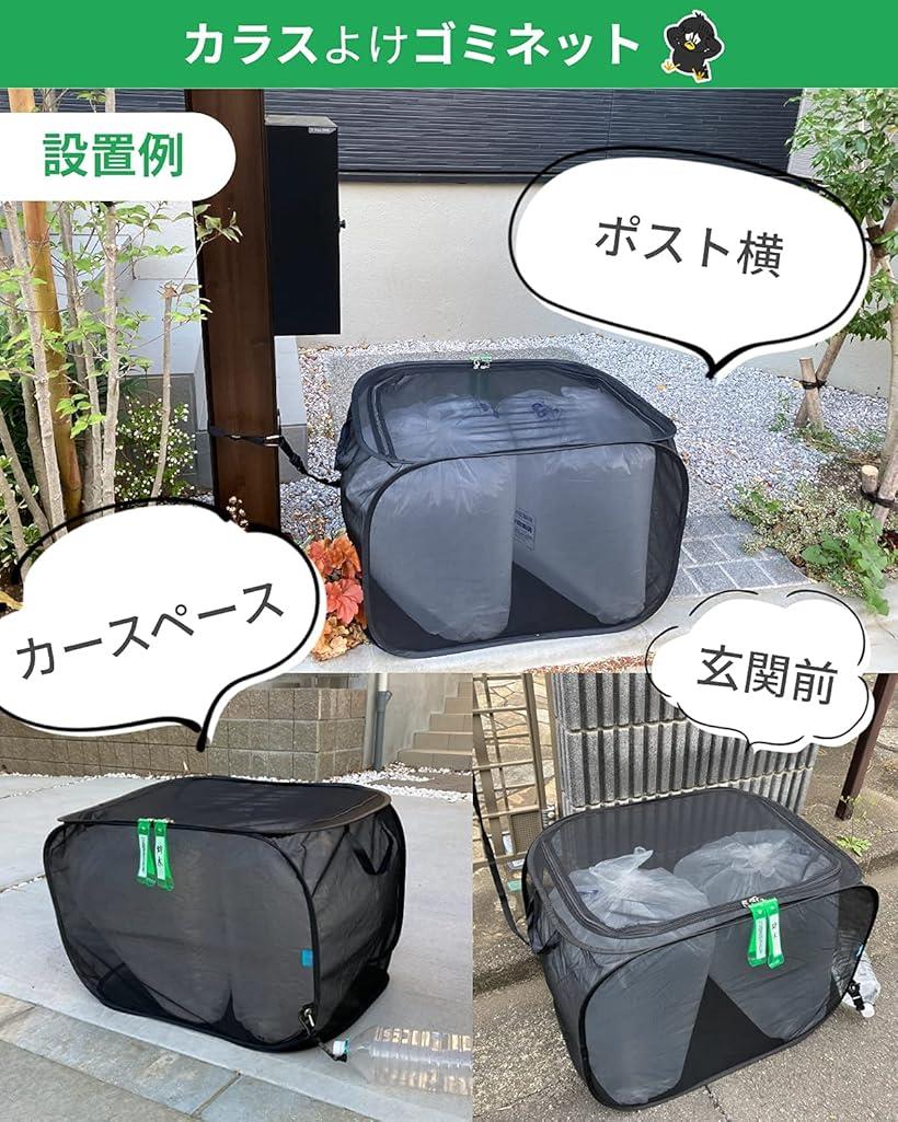 バリエーションコード : 2b46w21ysf商品コード2b46w21ysf商品名2024ver. ゴミネット ボックス ゴミ箱 屋外 ごみねっと カラスよけ ネット カラス対策 防鳥 防獣 ブラック 175L ポリエチレンブランドarumawaKカラーブラックサイズ等レギュラー「開封時のご注意」広げる際にワイヤーの跳ね返りにご注意ください。「サイズ」70x50x50cm *個々の製品により誤差が生ずる場合が有ります。「本体材質」・ネット=ポリエチレン・枠組み=スチール・ファスナー=合金(亜鉛メッキ処理)・持ち手=PVC*枠組みの生地破損によるワイヤー飛び出しや破損を防ぐため、保護する布を丈夫なバイアス素材の生地に変更して仕上げています。「容量」45Lごみ袋が2袋収納できます。「収納」直径25cmほどの円形に折り畳むことが可能です。*普段のご利用時にはフレームを内側に畳み、二つ折り(70cmx50cm)の状態で収納することをおすすめします。「セット内容」・ゴミネット本体(1)・固定ベルト(1)・ペットボトルホルダー(1)・ストラップ(2)「固定ベルト」最大で80cmまでの長さまで伸ばすことが可能です。「ペットボトルホルダー」長さ16cm2L入りの空きペットボトルを重石として利用することを推奨します。「ストラップ」16cm 大き目の存在感のあるストラップ。2本共に表面は記名できるように空白、裏面は予め(いつも回収ありがとうございます。)と印字されています。「ファスナー」害獣の侵入を防ぐことを第一優先に考えて締め切ってお使いください。「取っ手」引きずって移動しないように両端上部に持ち上げられるように取っ手を付けています。「ハトメ」前後の合計2カ所に固定できるよう金具(穴)を取り付けています。「注意事項」たたみ方の説明書を商品に同封してお届けしますが、日常は二つ折り(50cmx70cm)のまま保管いただくことを推奨いたします。※ 他ネットショップでも併売しているため、ご注文後に在庫切れとなる場合があります。予めご了承ください。※ 品薄または希少等の理由により、参考価格よりも高い価格で販売されている場合があります。ご注文の際には必ず販売価格をご確認ください。※ 沖縄県、離島または一部地域の場合、別途送料の負担をお願いする場合があります。予めご了承ください。※ お使いのモニタにより写真の色が実際の商品の色と異なる場合や、イメージに差異が生じることがあります。予めご了承ください。※ 商品の詳細(カラー・数量・サイズ 等)については、ページ内の商品説明をご確認のうえ、ご注文ください。※ モバイル版・スマホ版ページでは、お使いの端末によっては一部の情報が表示されないことがあります。すべての記載情報をご確認するには、PC版ページをご覧ください。「ワイヤーを保護する生地に違い」・ここに違いが。強度の高い生地にバイアスカットを使用し、伸縮性と強度を兼ね備えた製品になりました。・従来の生地生地が破れてワイヤーが。。一般的な平織りの生地ではコンクリートやアスファルトに擦れて破れやすかった・・・。・現在の生地現在の生地は丈夫で長持ち。バイアスカットされた生地がワイヤーをガッチリ保護。「余裕の大きさと感謝のストラップ」・見て。ここも違う。ゴミを出す方も回収を請け負う方もスムーズに気持ちよく過ごせればと願っています。・回収員さんへの感謝。ファスナーを閉じることでカラスに対しては効果大。しかし、回収員さんへの負担は増大・・・。少しでも感謝を伝えられれば負担の軽減に繋がると願っています。・詰め込まなくても出し入れらくらく。45Lのゴミ袋2つが重ねることなく横に並べて入るスペースがありますので入れやすい設計です。こちらも取り出しづらいと回収員さんの負担になってしまいますので出し入れ口は広い方が良いとされています。「カラス対策の決め手。ボックス型とワイヤー型の違い。」・これも見て。更に違う。日本のカラスはハシブトガラスとハシボソガラスが大半をしめます。体重は約0.5~0.75kg。・ボックス型強度はありますが、その分本体の端上に留まれてしまうため余裕を持って開口する時間が作れてしまいます。頭脳派のカラスには不安が残ります。・500mlのペットボトルでも転げ落ちる。・ワイヤー型警戒心の強いカラスはアンバランスなワイヤーの上では安定して留まりファスナーを開けることは難しいと考えられます。カラスに見立てた0.5kgほどの500mlペットボトルは転げ落ちてしまいます。・不安定な足場で留まり抑制。ワイヤーは柔らかく且つ軽いものを使用しています。カラスの被害をできるだけ軽減するためになればと考えております。「各種対策の紹介」風飛び、飛散、カラス除けの強化を徹底的にしました。本体を固定するためのカラビナ付きベルトを装着。固定する対象物がない場合に2Lペットボトルに取り付けられるボトルフックを装備。ファスナーのチャックが開けやすいようにストラップ付き。ストラップにゴミ回収のスタッフへ向けた感謝の言葉と裏側には記名可能です
