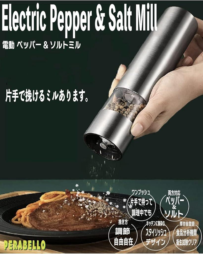 バリエーションコード : 2bjjyhpntr商品コード2bjjy8hh02商品名ペッパーミル 電動 ソルトミル 電動ミル スパイス ペッパー 岩塩 黒胡椒 コショウラウンダブランドPERABELLOサイズ等2個セット「プロのコックも愛用する」電動のソルト&ペッパーミルです。「片手で挽ける」今まで両手で(ガリガリ)やっていた人には革命。女性でも料理中でも片手でサッと使えます。「 厚労省の登録機関で衛生試験済」口に入るものを扱う器具なので専門機関で衛生試験を受けクリアしました。安心してご使用いただけると認められたミルです。「粗さ調節可能、ソルト&ペッパー両方対応」ソルト&ペッパー両方対応です、粗さ調節も可能で料理によってお好みの粗さに調節して使用できます。※ 他ネットショップでも併売しているため、ご注文後に在庫切れとなる場合があります。予めご了承ください。※ 品薄または希少等の理由により、参考価格よりも高い価格で販売されている場合があります。ご注文の際には必ず販売価格をご確認ください。※ 沖縄県、離島または一部地域の場合、別途送料の負担をお願いする場合があります。予めご了承ください。※ お使いのモニタにより写真の色が実際の商品の色と異なる場合や、イメージに差異が生じることがあります。予めご了承ください。※ 商品の詳細(カラー・数量・サイズ 等)については、ページ内の商品説明をご確認のうえ、ご注文ください。※ モバイル版・スマホ版ページでは、お使いの端末によっては一部の情報が表示されないことがあります。すべての記載情報をご確認するには、PC版ページをご覧ください。・1個あたり:単3電池x4本(別売り)