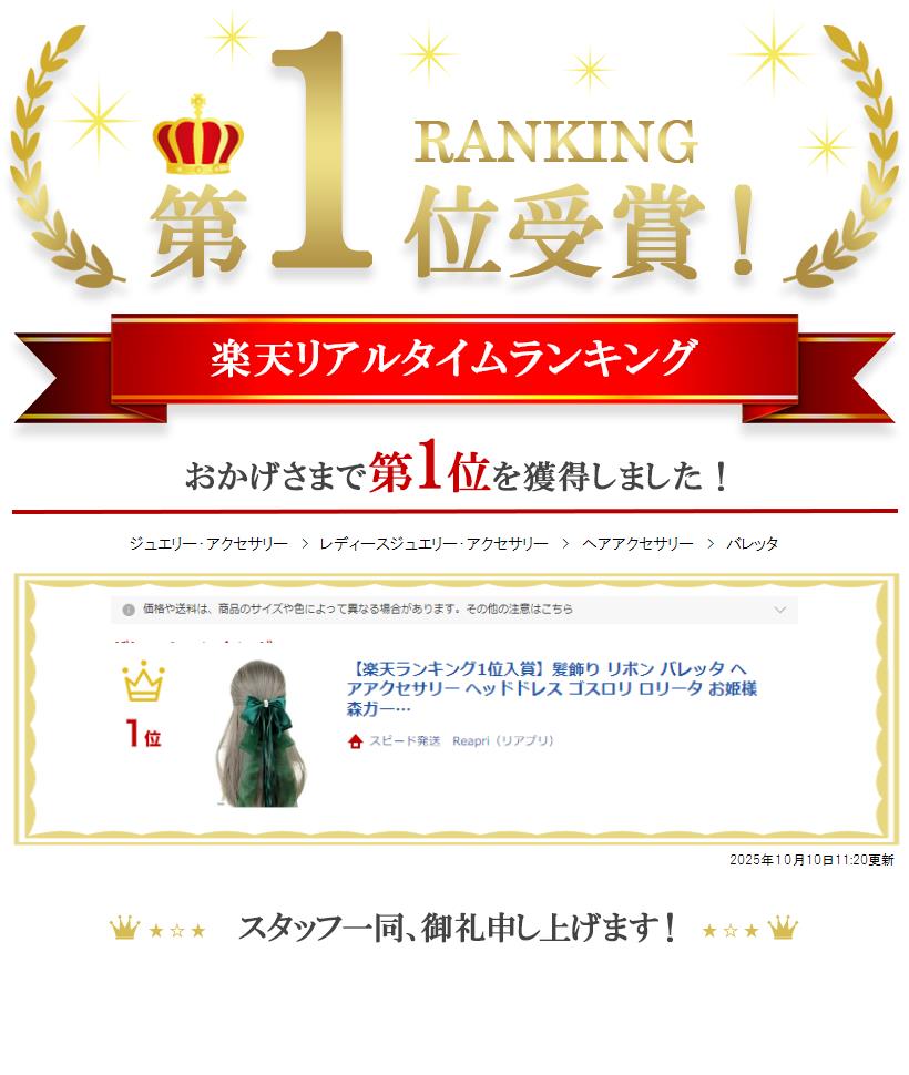バリエーションコード : 2b2jdgjpqv商品コード2b2jdgjpqv商品名髪飾り リボン バレッタ ヘアアクセサリー ヘッドドレス ゴスロリ ロリータ お姫様 森ガール グリーンブランドSCGEHAカラーGreen・サテンやオーガンジーのリボンを重ねたエレガントでかわいい髪飾りです。異なる素材を重ねたっぷりとした長さで高級感のある仕上がりに。クラシックな色使いが落ち着いた優雅な印象です。・フリルやレースがマストアイテムのロリータ・ゴスロリファッションにもぴったりのリボンヘアアクセサリーです。・長さ約8cm、幅1cmの大きめバレッタでワンプッシュの簡単開閉。毛量の多い方にもお使いいただけます。・イベント・パーティー・ハロウィン・クリスマスなどのコスプレ小物としてももちろん、結婚式・卒業式・入学式・発表会などの大切なイベントにもぴったり。普段使いのヘッドドレスとしても大活躍です。※ 他ネットショップでも併売しているため、ご注文後に在庫切れとなる場合があります。予めご了承ください。※ 品薄または希少等の理由により、参考価格よりも高い価格で販売されている場合があります。ご注文の際には必ず販売価格をご確認ください。※ 沖縄県、離島または一部地域の場合、別途送料の負担をお願いする場合があります。予めご了承ください。※ お使いのモニタにより写真の色が実際の商品の色と異なる場合や、イメージに差異が生じることがあります。予めご了承ください。※ 商品の詳細(カラー・数量・サイズ 等)については、ページ内の商品説明をご確認のうえ、ご注文ください。※ モバイル版・スマホ版ページでは、お使いの端末によっては一部の情報が表示されないことがあります。すべての記載情報をご確認するには、PC版ページをご覧ください。「サイズ」幅:約11.5cm 長さ:約53cm「カラーバリエーション」ブラック グリーン レッド パープル スモークピンク