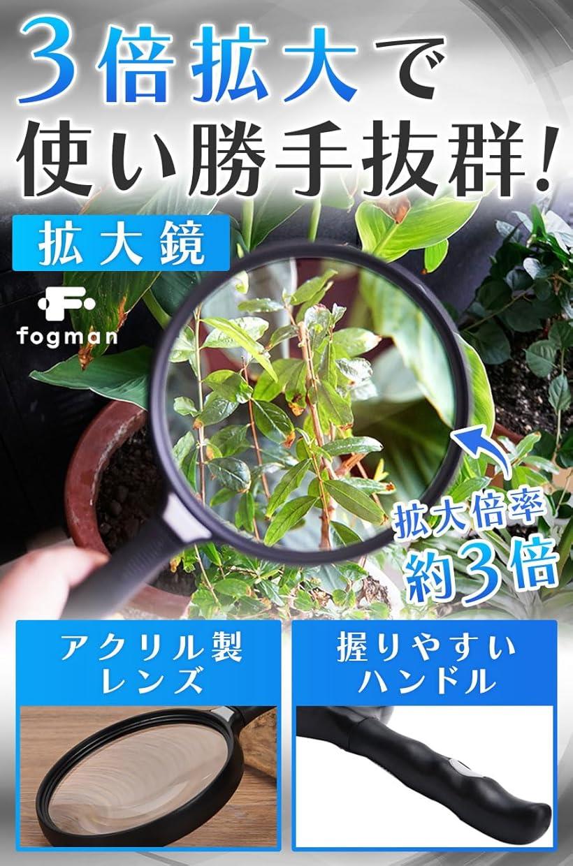 商品コード2bjlg1k0uf商品名拡大鏡 ルーペ 虫眼鏡 大きめ 使いやすい 手持ち 読書用 新聞 持ちやすいブランドfogmanカラーブラックサイズ等大「便利な特大サイズ」大きなレンズでとても見やすく、小さなお子様からご年配の方まで幅広く使える大型サイズの虫眼鏡です。レンズはアクリル製なので軽くて割れにくく、持ち運びたい時にも非常に便利です。「握りやすいハンドル」ハンドル部分は滑りにくいゴム製で、どなたでも握りやすいグリップデザイン。指にフィットする形状で長時間でも快適に使用可能。「様々な用途に大活躍」拡大倍率は約3倍なのでとてもよく見え、あらゆる研究や読み物に大活躍のアイテム。理科の実験や観察、地図や図面の確認、新聞や本を読みたい時など日常生活の様々なシーンに役立ちます。「贈り物にもおすすめ.」好奇心旺盛なお子様や、小さな文字が読みにくいというご年配の方へのちょっとしたプレゼントにもぴったりです。シンプルなので世代を問わず使用可能。「商品特徴」(1)約3倍の拡大倍率.:小さな文字も見やすいおよそ3倍の倍率。/(2)アクリル製レンズ:軽くて割れにくいので携帯にも便利。/(3)手に馴染むデザイン:手や指にフィットしやすい形状で持ちやすい。/(4)幅広いシーンに活躍:実験や研究・読書等あらゆる用途に。「商品詳細」素材:アクリルレンズ・ゴム重量:約200g/サイズ:25.8 x 14.3 cm (レンズサイズ:直径13cm)/セット:1個/商標登録第6354569号※ 他ネットショップでも併売しているため、ご注文後に在庫切れとなる場合があります。予めご了承ください。※ 品薄または希少等の理由により、参考価格よりも高い価格で販売されている場合があります。ご注文の際には必ず販売価格をご確認ください。※ 沖縄県、離島または一部地域の場合、別途送料の負担をお願いする場合があります。予めご了承ください。※ お使いのモニタにより写真の色が実際の商品の色と異なる場合や、イメージに差異が生じることがあります。予めご了承ください。※ 商品の詳細(カラー・数量・サイズ 等)については、ページ内の商品説明をご確認のうえ、ご注文ください。※ モバイル版・スマホ版ページでは、お使いの端末によっては一部の情報が表示されないことがあります。すべての記載情報をご確認するには、PC版ページをご覧ください。