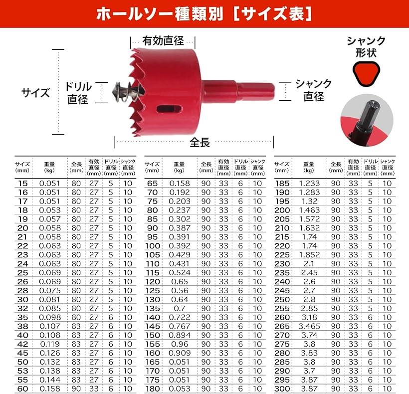 バリエーションコード : 2b4h9i6gd8商品コード2b4h9ixwoi商品名ホールソー バイメタル 穴あけ ドリルビット 切削 工具 DIY 鉄 アルミ 石膏ボード プラスチック 木材などに対応ブランドShopXJカラーレッドサイズ等160mm全66サイズ展開「材質」刃部は高品質のバイメタルを使用してます、切れ味、耐腐食性と耐摩耗性は強化され、耐久性もあります。センタードリルとシャンク部は高級ハイス鋼M42製です、切削加工性、靭性が強いです。「特長」バイメタルでは高級ハイス(M42)と強靭なバネ鋼を電子ビームで溶接し、高い切削性能を実現。コンビネーションピッチの採用で、穴あけ時の振動が抑えられ、精度の高い加工ができます。HSSセンタードリルにスプリング(バネ)がついてます、切り抜いたカスが押し出されるのでカスを取り除く手間が低減できます、それに貫通時に与えられる衝撃を緩和して刃部の損傷を防止、穴あけ作業の安全にもつながります。「用途」石膏ボード・プラスチック・木材・合板・薄鉄板・薄ステンレス板・薄アルミ板などの穴あけ作業に使われます。配管工事、電気工事と様々な穴あけ作業に、プロの職場から日曜大工、DIYの広まりまで活用されます。「対応機種」電気ドリル 、充電式ドリルドライバー 。精度が必要な場合は、ボール盤やドリルスタンドを利用してください。「注意事項」切削は低速回転からスタートしてください。必ず部材に対し垂直に使用してください。途中からドリルを傾けたりしないで下さい。金属の切削を行なう際は、切削油または水をかけながら作業を行ってください。使用中にゴーグルやマスクなどの保護防具を装着してください。※ 他ネットショップでも併売しているため、ご注文後に在庫切れとなる場合があります。予めご了承ください。※ 品薄または希少等の理由により、参考価格よりも高い価格で販売されている場合があります。ご注文の際には必ず販売価格をご確認ください。※ 沖縄県、離島または一部地域の場合、別途送料の負担をお願いする場合があります。予めご了承ください。※ お使いのモニタにより写真の色が実際の商品の色と異なる場合や、イメージに差異が生じることがあります。予めご了承ください。※ 商品の詳細(カラー・数量・サイズ 等)については、ページ内の商品説明をご確認のうえ、ご注文ください。※ モバイル版・スマホ版ページでは、お使いの端末によっては一部の情報が表示されないことがあります。すべての記載情報をご確認するには、PC版ページをご覧ください。