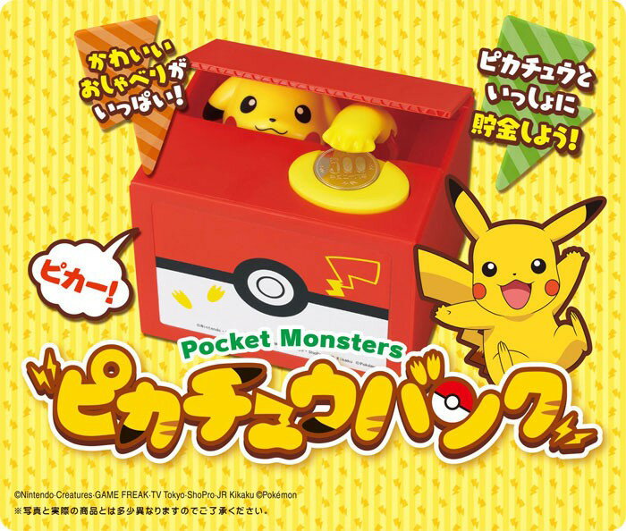 本商品は、通常1〜2営業日以内に発送(営業日6時までのご注文分)お支払い方法・送料についてピカチュウバンク 貯金箱 【ポケットモンスター ポケモン いたずらBANKシリーズ いたずらバンク シャイン】ピカチュウバンク 貯金箱 【ポケットモンスター ポケモン いたずらBANKシリーズ いたずらバンク シャイン】何度でも貯金したくなる、とっても可愛い癒し系貯金箱♪話題の「いたずらBANK」に「ピカチュウ」登場! 「ピカチュウ」が可愛く鳴いてコインをお預かりモンスターボールをイメージしたカラーの箱にコインを置くと、鳴き声と共に「ピカチュウ」が現れ、コインを大事にお預かりするという商品です。「ピカチュウ」のおしゃべりパターンは243通りもの組み合わせがあり、「ピカチュウ」がコインを引き込むアクションと共に何度でも楽しむことができます。■商品サイズ : 102×126×106(mm)■使用電池 : アルカリ単3電池×2本(別売)■対象年齢 : 6歳以上■メーカー:シャイン