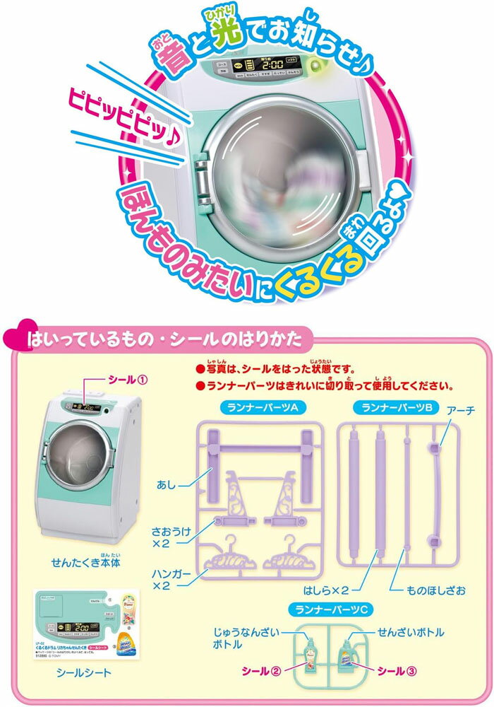 本商品は、通常1〜2営業日以内に発送(営業日6時までのご注文分)お支払い方法・送料についてリカちゃん LF-02 くるくるドラム リカちゃんせんたくき (2023年発売版) 【着せ替え人形用 ドラム式洗濯機 家電 家具 おままごと 玩具 おもちゃ 誕生日】リカちゃん LF-02 くるくるドラム リカちゃんせんたくき (2023年発売版) 【着せ替え人形用 ドラム式洗濯機 家電 家具 おままごと 玩具 おもちゃ 誕生日】ミントカラーがおしゃれな、電動のドラム式洗濯機。ドラムが回転して洗濯される様子が楽しいリカちゃん家具です。せんたくき本体のボタンを押すとLEDが光り、リアルな音とともにドラムが回転し洗濯が始まります(30秒間)。組立て式のものほしだい、せんざいボトル、じゅうなんざいボトル、ハンガー(2個)付き。ついついドレスを入れて、繰り返し洗濯ごっこをしたくなります。【セット内容】せんたくき本体(1)、ランナーパーツA(1)、ランナーパーツB(1)、ランナーパーツC(1)、シールシート(1)※リカちゃん人形本体は付属しません。■メーカー:タカラトミー(TAKARA TOMY)