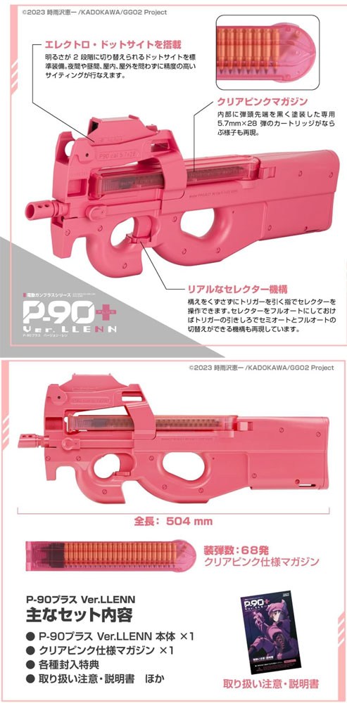 東京マルイ 電動ガンプラス P-90プラス バージョン・レン ソードアートオンライン・オルタナティブ ガンゲイル・オンラインII コラボレーションモデル TVアニメ「SAO オルタナティブ ガンゲイル・オンラインII」とのコラボレーション・モデルTVアニメ「ソードアート・オンライン オルタナティブ ガンゲイル・オンラインII」とのコラボレーションモデルが、期間生産品『P-90プラス バージョンレン』として発売決定!主人公レンの愛銃「ピーちゃん」ことピンクのP-90を、原作:時雨沢恵一氏・銃器設定協力:秋本こうじ氏の両名による監修のもと、最新のFET回路を搭載した電動ガンプラス『P-90プラス』をベースにリアルな質感で再現しています。■全長 505 mm■銃身長 247 mm■重量 2,200 g(空マガジン、ニッケル水素バッテリー含む)■弾丸 6mm BB(0.2〜0.25g)■動力源 8.4Vニッケル水素1300mAhミニSバッテリー(※1)/ MS?Li-Poバッテリー[スタンダードタイプ](※2)■装弾数 68 発※18歳以上用※1:バッテリーの充電には、8.4Vニッケル水素バッテリー専用の充電器をご使用ください。※2:バッテリーの充電には、MS?Li-Poバッテリー専用の充電器とセーフティバッグをご使用ください。【SAO ver. LLENN No.4】■メーカー:東京マルイ本商品は、通常1〜2営業日以内に発送(営業日6時までのご注文分)お支払い方法・送料について東京マルイ 電動ガンプラス P-90プラス バージョン・レン ソードアートオンライン・オルタナティブ ガンゲイル・オンラインII コラボレーションモデル