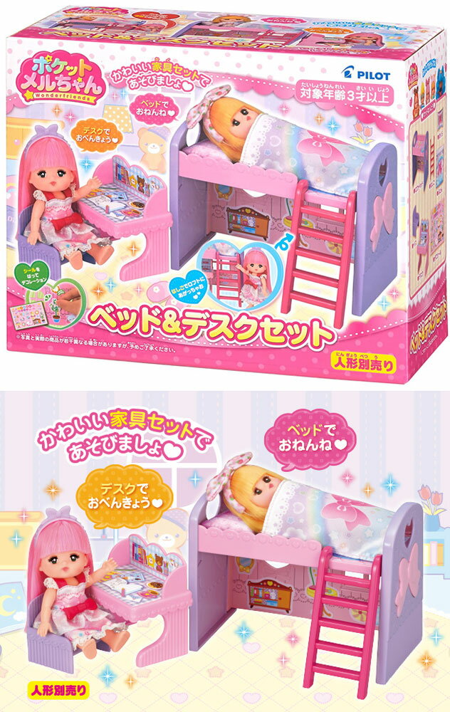 本商品は、通常1〜2営業日以内に発送(営業日6時までのご注文分)お支払い方法・送料についてポケットメルちゃん ベッド&デスクセット 【家具 パーツ 机 手のひらサイズ 着せ替え人形用 めるちゃん 玩具 パイロットインキ】ポケットメルちゃん ベッド&デスクセット 【家具 パーツ 机 手のひらサイズ 着せ替え人形用 めるちゃん 玩具 パイロットインキ】手のひらサイズのポケットメルちゃんシリーズデスクでおべんきょうしたり、かわいいおふとんとまくらをベッドにセットしておねんねしたりしてメルちゃんといっしょにあそびましょ。ベッドははしごつきです。ポケメルハウスと組み合わせてあそんでも楽しいよ!【セット内容】ロフトベッド、はしご、まくら、ふとん、イス、デスク、デコシール■対象年齢 3歳以上※ポケットメルちゃん用のサイズですので、通常サイズのメルちゃん用の商品より小さいサイズの商品になります。■メーカー:パイロットコーポレーション