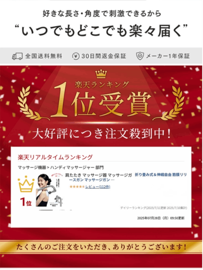 商品情報特徴■ 特長もっと手軽に。USB充電式・コードレス設計で、どこでも使える筋膜リリースガンが登場です!パワフルなブラシレスモーターと大容量バッテリーを搭載。静音設計だから、朝でも夜でも周りを気にせず使えます。Type-Cポート採用で充電もスムーズ。長時間使えるから、忙しい毎日でもしっかりボディメンテナンスできます。軽くてコンパクトなボディは、片手でラクラク操作OK。自宅はもちろん、オフィスやジムでも活躍間違いなし!付属の4種類のアタッチメントで、部位に合わせたケアができるのも嬉しいポイントです。コードレスだから、好きな場所で気軽に使えるパワフルなのに静か!しっかりリリースできる強さは5段階調整。自分にぴったりの強度にカスタマイズType-Cポートで高速充電対応長時間使用でもパワーキープ自動オフ機能付きで安心設計毎日がんばる自分へのごほうびに。本格ケアを、もっと身近に。■ さらに本製品特長●角度調整可能: 54° / 90° / 126° の3段階で折りたたみ・伸縮が可能●9cm延長アーム付き: 背中、ふくらはぎ、太ももなど、部位に合わせて自由に長さ調整●持ち運び便利: 旅行や外出時にも折りたたんでコンパクトに収納。バッグやポケットに入るサイズ感で小●軽量470g説明1,最大10mmの振幅,深層筋肉に届ける振動。弊社のリリースガンは、長い一日の仕事の後にリラックスしてください。振り幅最大10mmの振動が筋肉にしっかりアプローチ。振動だけではなく、筋肉の奥までリラックス。すべての操作をワンボタンで簡単に制御できます。1000~2600回/分の振動強度調整機能を搭載し、5段階の強度、強度は最弱、弱、中、強、最強の5段階で調整が可能。4種類のヘッドが装備されており、ニーズに応じて、球形、U形、円柱形、平形のアタッチメントが交換できます。それに、環境に優しい高品質のシリコン素材で作られたヘッドは、表面が柔らかく、柔軟にお使いいただけます。さらに、耐久性に優れ、汚れにくく、掃除が簡単です。2,簡単で安全に試用できます。統合された赤外線加熱機能を備えたマッサージャーは、10分以内に自動的に遮断されます。(手動でおふにできます)3,調節可能な強さ。このリリースガンは5つの筋力レベルを備えているため、圧力をパーソナライズして長いハンドルストラップを使用してマッサージー位置と筋力を調整することも出来ます。4,1500mAhの充電ケーブルが組み込まれているため、ワイヤレスマッサージを実現し、自由にマッサージできます。着用可能なリュックサックを着用したデザインで、毎日の作業に手が自由になり、自宅でもオフィスでも肩に負担をかけることなく着用できます。あなたが愛する人のための素晴らしいギフトのアイデアの選択。家庭、オフィス、車、旅行に最適。5、4種類のマッサージヘッド。体の部位によってヘッドを変えられます。癖になる気持ちよさ。6,パワーアップ!低騒音・より強く・より安定・より耐久性。筋膜リリースガンは最先端のブラシレスモーターを採用し、従来品と比べ、電動機の効率が200%向上し、より安定した安全性能が備わっており、ブラシレスモーターは摩擦による「整流子やブラシ」消耗がなく長寿命です。電気ノイズが少ないため静音性に優れ、電力供給も安定しています。双チュアベアリングにより、リリースガンが手を震わせなくなります。7、弾性アーム。本体を延長し、流線型のアーチを採用し、柔らかい手触りで伸縮性があり、異なる体格と年齢の人に適しています。延長ハンドルは、人間工学に基づいたデザインで、人体にフィットし、力を節約します。脚をケアする際、腰を曲げる必要はありません。手を伸ばすのは簡単で、死角を避け、全身のどこでもりリラックスできます。仕様商品名 スマート肩首揉みマッサージ機素材 複合材料製品サイズ(約)232×145×48mm箱サイズ:266×164×55mm重量(約) 470gバッテリー容量 1500mAhパワー 2A/15W電圧 7.4V充電口 Type-C耐水レベル:非防水セット内容 本体、日本語取扱説明書、Type-C充電ケーブル注意事項【ご購入前に必ずご確認ください】本製品は医療機器ではなく、治療やマッサージ効果を目的とした製品ではありません。あくまで家庭用一般家電であり、効果を保証するものではありません。使用にあたっての注意点: 医師の治療を受けている方、ペースメーカーなどの医療用電子機器をお使いの方、術後の方、気になる症状がある方は必ず医師にご相談のうえご使用ください。 振動部分を体に強く押し当てると安全装置が作動して自動停止します。ご使用の際は軽く当ててご使用ください。 詳細な注意事項は取扱説明書に記載しておりますので、ご使用前に必ずお読みください。検索キーワード筋膜リリース ガン 電動マッサージ器 ハンディガン アタッチメント 5レベル調節 全身ケア リラックス ストレス解消 軽量 筋膜 筋肉 全身用 健康グッズ トレーニング ハンディ 筋膜リリースガン マッサージガン コードレス プロ用 静音 筋トレ後 回復 高