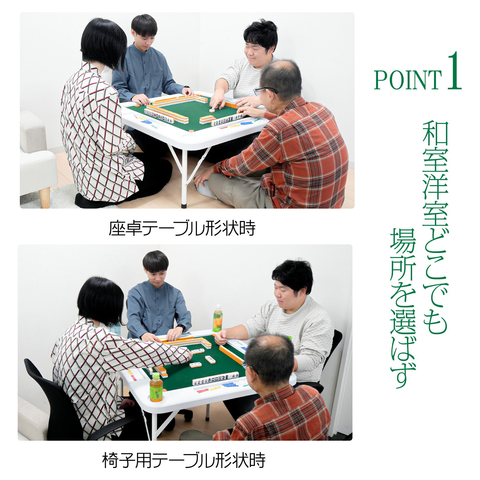 2段階で高さ調節可能。点棒などが置ける溝・ドリンクホルダー付きで快適に麻雀が楽しめる、家庭用折りたたみ式手打ち麻雀テーブル。ご自宅のほかにも社内クラブやアウトドア・施設・教室など、用途や場所を選ばずにご使用いただけます! ◆腕力に自信が無い方でもラクラク。組み立て・脚の高さ調整・折りたたみ作業は、おひとりでもスムーズに行えます。 ◆撥水加工を施した麻雀マット。ドリンクをこぼしてしまっても、布巾などで拭き取って麻雀を引き続き楽しめます。 ◆脚をしっかりと固定する金具付き。組み立てた状態で持ち運んだ際に起こりやすい「脚の抜け落ち」を未然に防ぎます。 ◆天版は高密度ポリエチレンPEマテリアル製のハニカム構造で軽量かつ丈夫。さらに表面を木目調に仕上げました。品質・デザイン双方で拘り抜いた、高品質の麻雀テーブルです。 【商品仕様】 ■本体サイズ(約):幅90cm×奥行90cm×高さ74cm ■収納サイズ(約):幅90cm×奥行90cm×高さ5cm ■重量(約):9kg ■高さ調整:2段階 ※麻雀牌・点棒などは別売りです。本品には付属しませんのでご注意ください。【2色展開】麻雀 卓 折りたたみ テーブル マージャン 折り畳み 収納 手打ち 省スペース 高さ調節 2段階 家庭用 自宅 施設 クラブ 教室 部活 雀鳳 ジャンホウ 高さを変更できる脚で、椅子に座りながらでも座卓でも遊べる。 未使用時はコンパクトに折りたたみ。利便性抜群の手打ち麻雀テーブルです。 選べる2カラー 設置場所やお好みに併せて選べる2色をご用意。 モノクロカラーで、お部屋の雰囲気を損ないません。 手軽に麻雀が楽しみたい。そんな方におススメです! 本格的な麻雀卓は要らないけれど、麻雀を楽しみたい。 そのような方に、麻雀テーブルがおススメ! ・リーズナブルな家庭用麻雀卓が欲しい ・椅子座りでも座卓でも好きなように遊びたい ・邪魔にならない麻雀卓が欲しい ・場所を問わずに使いたい 弊社の折りたたみ麻雀テーブルは、上記の希望に答えます! 和室でも洋室でも大活躍! 折りたたみ麻雀テーブルは、使用したい場所や気分に合わせて設置可能。 シンプルなデザインなので、和室でも洋室でも場所を選ばずに遊べます。 未使用時はコンパクトに収納 厚み5cmで、家具の隙間にラクラク収納OK。 麻雀で遊ばない時も、コンパクトに折りたためて邪魔になりません。 対局に集中できる広い溝付き 広々した溝付きで、点棒などが容易に置けます。 小物がテーブルからズレたり滑り落ちず、集中して麻雀をプレイできます。 ドリンクホルダー付き ペットボトルやタンブラーなど、飲み物が置けるドリンクホルダー付き。 サイドテーブルが不要なので、狭い部屋やアウトドアでも麻雀が楽しめます。 万一の時もラクラクお手入れ 撥水性抜群のマットで、飲み物をこぼしてしまっても安心。 乾いた布巾などでサッと拭いて、快適に遊び続けられます。 移動時に脚が落ちない 金具で脚をしっかりと固定。持ち運び時や組み立て時に生じやすい 「脚の抜け落ち」を未然に防ぐので、安心して取り扱えます。 こだわり素材の天板 高密度ポリエチレンPEマテリアル素材を採用。 ハニカム構造で、軽量かつ丈夫な麻雀テーブルです。 テーブル表面を木目調に加工。デザインもお洒落に仕上げました! シーンを選ばずに遊べる! ・自宅で家族や仲間達と麻雀で遊びたい時に。 ・会社の麻雀クラブに導入して、社員の交流場に。 ・老人ホームに導入して、入居者の交流や脳トレに。 ・学校に導入して、学生麻雀部でのご使用に。 ・麻雀教室に導入して、生徒の指導や演習に。 汎用性抜群。幅広い場所やシーンでご利用いただけます。 製品詳細 ※麻雀牌・点棒などは実際の製品に付属しておりません。 展開・高さ調節方法 力の弱い方でも、3ステップでラクラク作業が行えます♪ 老若男女問わず皆で遊べる! ご家族・友人・仲間達と。交流の場に是非ともご活用ください! 使用イメージ 安心の1年保証付き ▼ セットですぐ遊べる! ▼ ▼ 本格麻雀がしたい方向け!全自動麻雀卓はこちら! ▼