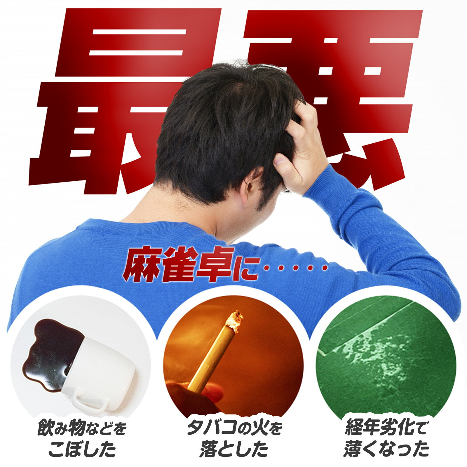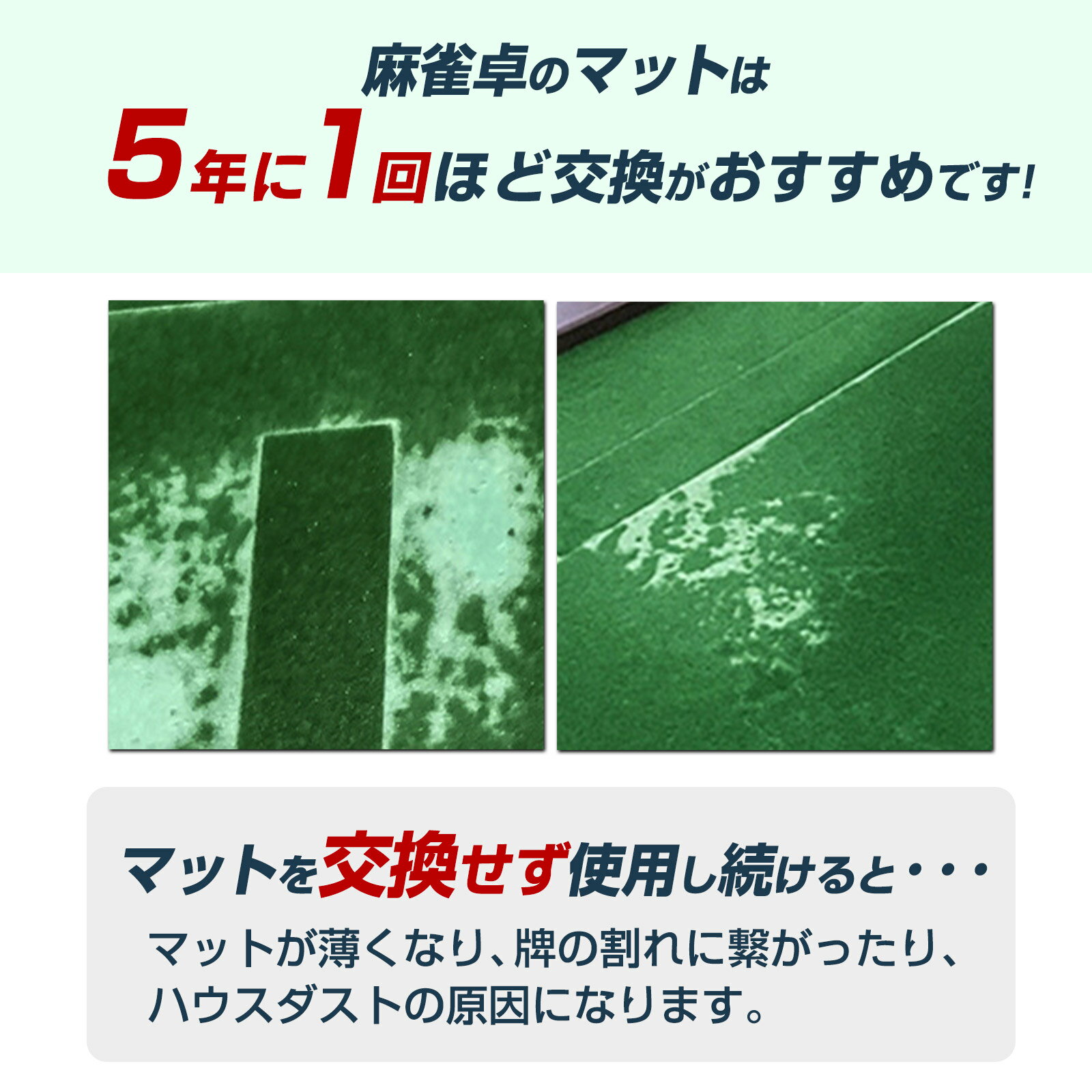 ■製品詳細■ サイズ:77×77×0.2cm 素材 :PVC製 ※こちらは「ONE STEP」・「雀鳳」の麻雀卓に対応しており、 対応していない麻雀卓にご使用なられた場合に関しましては、 ご負担いたしかねますので、予めご了承ください。 ■製品説明■ ○麻雀卓のマットは5年に1回ほど交換がおすすめです!マットを交換せずに使用し続けると、 マットが薄くなり、牌の割れにつながったり、ハウスダストの原因になります。 また、飲み物をこぼす・タバコの火を落とす等の原因でマットが破損した場合にも交換がおすすめです! ○当店の交換マットは高品質PVC素材採用で触り心地はよく、耐久性が高い! ○接着剤不要!交換マットの裏面はテープで貼り付けが可能!糊貼り等は必要ございません! ■交換方法■ STEP1:古いマットを剥がします STEP2:麻雀卓に新品の交換用マットを貼ります。 STEP3:貼り付け後、不要な場所をカッターで切り取ります。 ※麻雀牌・中心部は一度切り取ってから貼り付ける必要がある為、 丁寧に切り取り、廃棄しないようお願いいたします。 こちらの商品は「ONE STEP」・「雀鳳」全自動麻雀卓用のマットです。 ※北海道、沖縄または離島への配送は中継料金1,000円が発生しますので、予めご了承くださいませ。ONE STEP 雀鳳 対応 麻雀マット単品 交換用マット 麻雀 グッズ 麻雀卓 マージャンマット 天板マット 接着剤不要 PVC製 全自動麻雀台 77*77*0.2cm 最悪!!麻雀卓に…… 飲み物等をこぼした タバコの火を落とした 経年劣化で薄くなった 麻雀卓のマットは5年に1回ほどの交換がおすすめです! マットを交換せずに使用し続けると…… マットが薄くなり、牌の割れにつながったり、ハウスダストの原因になります。 交換前後比較 気になる汚れを解決! 触り心地抜群! 高品質PVC素材採用で触り心地が良く、より高耐久性 接着剤不要 テープで貼るだけなので糊貼りは必要なし! 交換方法 交換方法の動画を掲載しておりますので、交換する際には、そちらのご確認もお願いいたします。 STEP1:古いマットを剥がします STEP2:麻雀卓に新品の交換用マットを貼ります。 STEP3:貼り付け後、不要な場所をカッターで切り取ります。 ※麻雀牌・中心部は一度切り取ってから貼り付ける必要がある為、 丁寧に切り取り、廃棄しないようお願いいたします。 CHECK 2パターンの方法が有りますので、お客様のやりやすい方で交換してください。 製品詳細 サイズ:77cm×77cm×0.2cm 素材 :PVC素材 こちらは「ONE STEP」・「雀鳳」の麻雀卓に対応しており、 対応していない麻雀卓にご使用なられた場合に関しましては、 ご負担いたしかねますので、予めご了承ください。 ▼ 対応の全自動麻雀卓はこちら! ▼