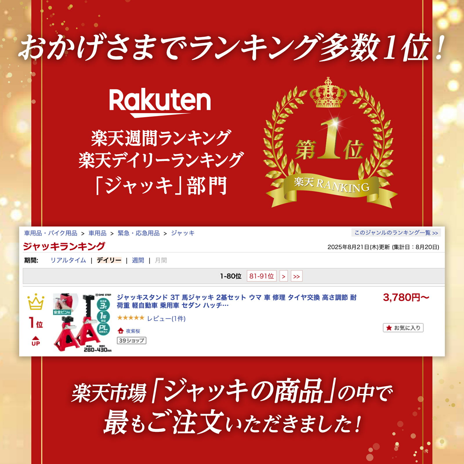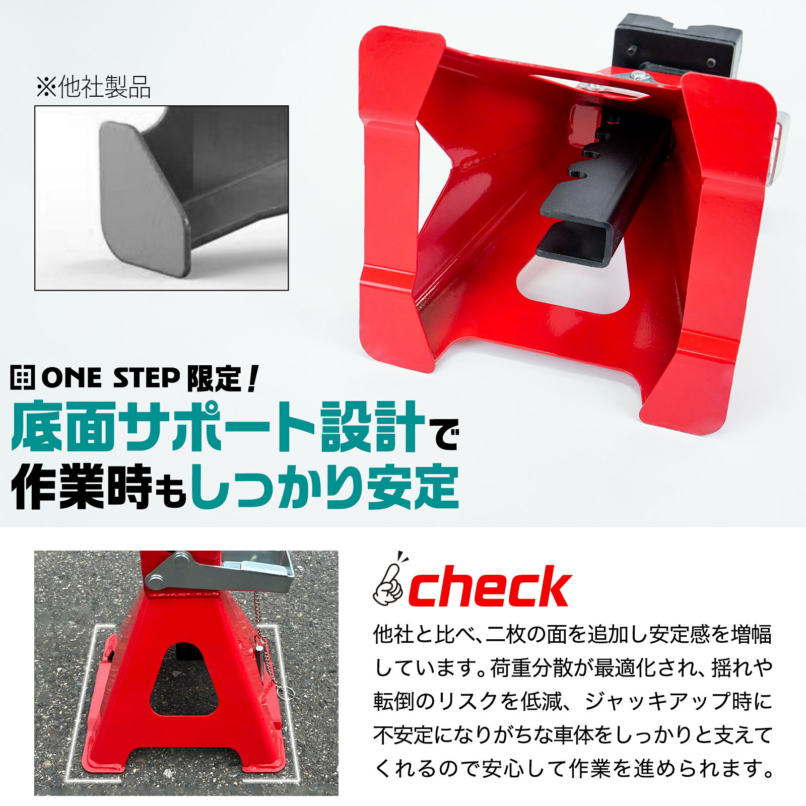 【二重ロック設計】6段階の高さ調整が可能(280~430mm)。二重ロック機構を備えており、車両の修理作業などで安心してご使用いただけます。 【30mmゴムパッド】ラチェットハンドルに厚さ30mmのゴムパッドを使用することで、持ち上げ中に発生する車体の傷付きを防止し、車を保護しながら作業が行えます。 【積載能力抜群】安定性抜群の4脚マット。最大耐荷重は3t。様々な車にご使用いただけます。 ※1基のみや、奇数で使用されると安定性が悪くなります。重篤な事故につながる恐れがあるため、ジャッキスタンドは偶数(2基・4基)でご使用ください。 ※ご使用中は全てのジャッキの高さが"必ず"同じになるように調整ください。 【丈夫で長持ちする素材】丈夫なスチール素材を使用。防錆コーティングを施しており、長くお使いいただいても劣化しにくいです。楽天ランキング第1位獲得!! 【3t・2基セット】ジャッキスタンド ウマ 馬 防錆 自動車 軽 トラック 修理 タイヤ交換 メンテナンス 高さ調節 面設計 ラバーパッド 2重ロック ONE STEP 愛車のメンテナンス・修理・タイヤ交換時に重宝! 抜群の安定性で作業を快適に行える、高さ調節機能付きジャッキスタンドです。 愛車の手入れは行っていますか? 愛車のメンテナンスは、ガソリンの補給や洗車だけではありません。 例えば、走る度に劣化するタイヤを定期的に交換しなければいけません。 雪国や、夏に路面が熱くなりやすい地域では特に、 季節ごとにタイヤ交換をしないと、運転中にスリップなどの危険が生じます。 さらに車は車検時以外でも、おもわぬ故障や破損も起こりやすい。 定期的にメンテナンスをすることで、車の寿命を確実に伸ばせます。 業者はお金が掛る。自分でするのは凄く怖い…。 車に関する作業は、カー専門店などの業者に依頼する人が多いです。 しかし業者に依頼をすると、お金が掛るし愛車の状態が分からず不安…。 実は車のメンテナンスは、ジャッキと専用のスタンドを使えば ご自宅でも必要最低限の費用で作業を行うことができます。 「だけど車のメンテンナンスを自分でやるのは怖い…」 「素人がしたら車の下敷きになりそう…」 「作業中にジャッキスタンドが倒れないか心配…」 上記のように、愛車のメンテナンスを自分で行う事に対して、 事故や安全面を心配する人も多いでしょう。 弊社のジャッキスタンドを使えば、安心して作業が行えます! 3t(トン)までの車を支えるパワフルな耐久性! 脚部分が面になっているので、作業中にスタンドが倒れる心配不要! 支柱の長さを調整可能!上級者の方はもちろん、初心者も作業しやすい! ONE STEPのジャッキスタンドでセルフ作業をして、 コストを抑えながら、大切な車を定期的にメンテナンスしましょう! 面設計の脚で安定性抜群! ONE STEPのジャッキスタンドは、脚部分が面になっています。 4脚の製品と比べて、地面と密着する面積が大きいため、 ジャッキから車を降ろす時や、作業中にスタンドがバランスを崩して 倒れることによる、車の傷付きや下敷き事故を防ぎます。 愛車を傷つけないラバーパッド付き 車の底面と接触する部分に、厚手のゴム素材を使用! ジャッキアップした車両をスタンドに降ろした際の 車体の傷付きを防止します。 6段階で高さ調節可能! 280mmから430mmまで、作業しやすい高さに支柱の長さを調節できます。 固定はコントロールレバーと安全ピンのWロック式。 支柱をしっかりと固定するので、作業中に支柱が縮んでしまう心配も不要です。 コントロールレバー採用 ラチェット式で調整がラクラク 高さを6段階で調節可能!片手でも楽に操作できます。高さを下げたい時はレバーを上げ、受け皿を下げるだけ! 高さ調節・設置方法 初心者でもラクラク設置できます♪ ジャッキスタンドは"必ず"2基1組でご使用ください。 様々な車に対応! 耐荷重3t(トン)のパワフルなジャッキスタンド! 軽自動車からコンパクトカー・セダン・ハッチバック・軽トラックまで、 様々な車種にご利用いただけます。 サイズ詳細・注意/確認事項 万が一の事故に備えた安全ピン 作業中に誤ってレバーを上げてしまい、受け皿が落ちてくる心配無し! 安心してご使用していただけます。 安心してお使いいただく為の保証付き ▼ ジャッキも取り扱っています! ▼ 3t 油圧式 フロアジャッキ 2t 収納ケース付き 油圧ジャッキ 3t 薄型 フロアガレージジャッキ
