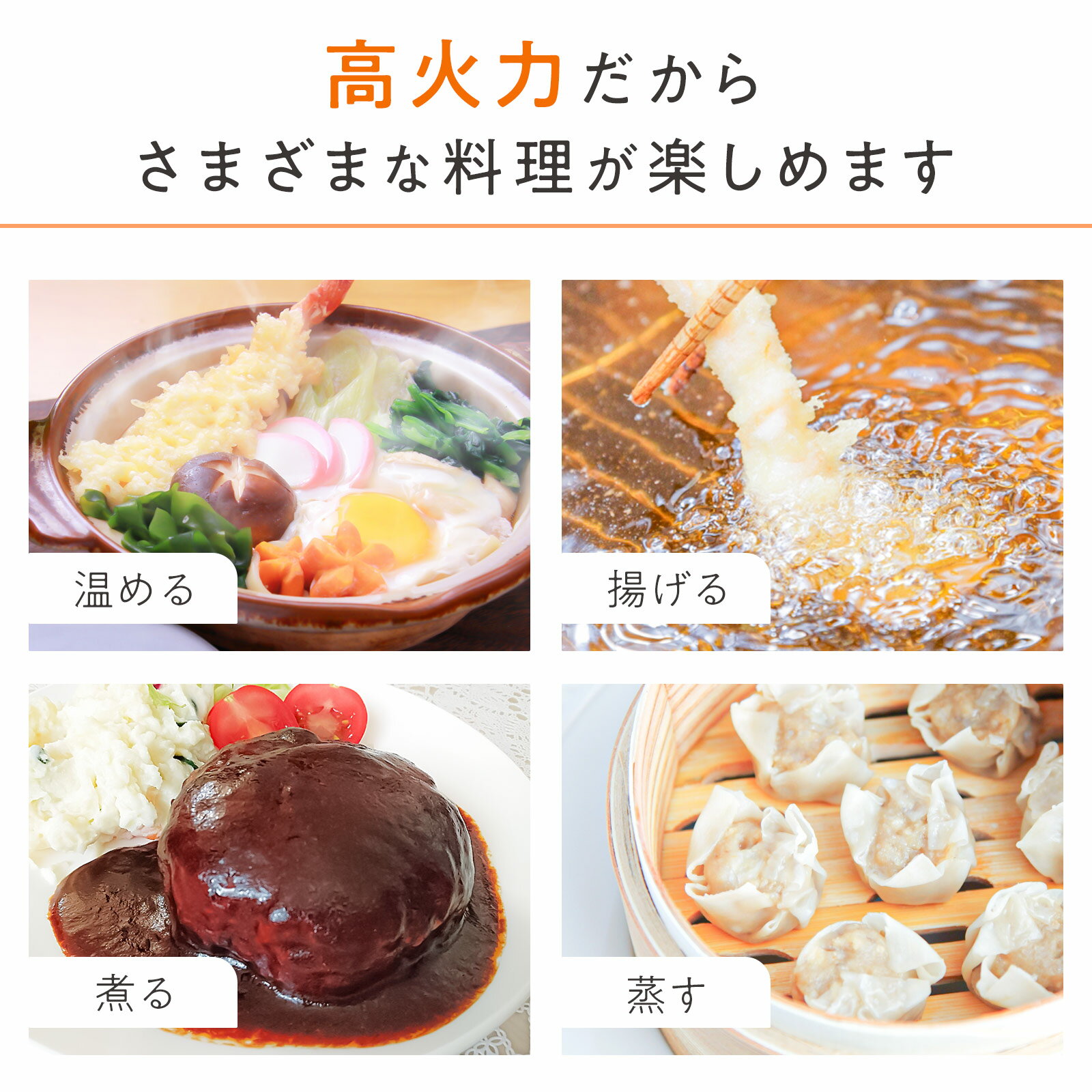 独り暮らしの自炊に!狭いキッチンの救世主に!家族みんなの食卓にも!火力の細かな調整ができるIHクッキングヒーターが大活躍!まるでガスコンロのような火力で、ハンバーグやステーキ、煮物、焼き魚、カレーやシチュー、すき焼きも美味しく作れる!揚げ物を作る為の機能が搭載されているから、天ぷら・フライ・唐揚げやポテトフライも調理できます! 【パワフル火力】 作りたいメニューに合わせて、熱の強さを細かく調整できます。 【揚げ物も作れる】 揚げ物モードを搭載。低温で揚げるポテトフライやドーナツ、高温でサクッと揚げる天ぷらまで、従来のIH調理機では難しかった揚げ物も調理可能です。 【シンプル操作で使いやすい】 タッチパネル式のワンタッチ操作。機械が苦手な方も扱いやすいです。 【万一の事故も未然に防止】 自動電源オフ機能・鍋検知センサー・過熱防止機能・チャイルドロック機能搭載。加熱調理器具で起こりやすい事故を未然に防ぎます。 【コンパクト設計】 未使用時は棚の中や引き出しに収納できる!卓上に出して、キッチン以外の場所でもご使用いただけます。 【製品詳細】 ●サイズ:35×28×6.5cm ●消費電力:最大約1400W/最大約1000W ●重量:約2kg ●電源コード:約1.2m ●火力調節 加熱モード:100~1400W(9段階)/100~1000W(8段階) 揚げ物モード:約140℃~200℃【1口/液晶パネル】IH クッキングヒーター コンロ 卓上 煮物 揚げ物 焼き物 炒め物 保温 自炊 キッチン家電 一人暮らし 独り暮らし 新生活 サブ 料理 ONE STEP 火力の細かな調整で様々な料理が作れる! 使い勝手抜群のIHクッキングヒーターです。 一人暮らしの自炊に!家族とのアツアツご飯に! 利便性抜群のクッキングアイテム! 一人暮らしの方で多い悩みは、家のキッチンが狭くて使いづらい事…。 ワンルームの家は、キッチン設備が充実していないケースが多いです。 節約の為、健康の為に、自炊に励みたくても、 設備が乏しいキッチンでは、思い通りの料理が作れない…。 このように、悩んでいませんか? 当社のIHクッキングヒーターで、自炊の悩みを一気に解決! 電気調理機器で懸念される、火力問題も心配無用! 火力の細かな調整で、炒め物から揚げ物まで、 作りたい料理を作りたい時に、コレ1台あれば出来ちゃいます! お鍋やチーズフォンデュなど、家族みんなで食べるアツアツ料理にも! サッと取り出して直ぐ使える、利便性抜群のクッキングアイテムです! まるでガスコンロのような強火力! IHクッキングヒーターは強火力で料理OK! しっかりと焦げ目を付けたいハンバーグや、 シャキシャキ食感の野菜炒めが作れます! さまざまな料理が作れる! 従来のIHコンロでは実現しにくかった「揚げ物」が作れる! 炒め物、焼き物、煮物、鍋物、蒸し物も、 作りたい料理が思いのまま、コレ1台で作れます! ※揚げ物は専用の調理モードをご使用ください。 食卓に置いてもアツアツ! タイマー設定できる保温機能付き。 時間が掛かる煮物料理や焼き物の調理時、 食卓で料理を長くアツアツで食べたい時に活躍します! まるでガスコンロ。なのにガスより経済的! ガスコンロのような強火力なのに、圧倒的な省エネも実現! IHの強みも備え持っているので、コストパフォーマンス抜群です! ※画像の料金比較は目安です。ご契約の電気会社で金額に多少の差が生じます。 タッチパネルで操作しやすい! 火力調整も保温時間の設定も指1本でラクラク操作! ガスコンロより扱いやすいので、料理の失敗もしにくいです。 事故の心配も無用! 自動電源OFF、過熱防止センサー、ロック機能付き。 火や電気を使う機器で起きやすい、事故の発生を未然に防ぎます。 収納ラクラク! 厚さ6.5cmのスリム設計!引き出しにも入る! 使わない時はラクラク収納できるので、キッチンがスッキリ片付きます! お手入れラクラク! 強化フラットガラス天板。凹凸が無いので掃除しやすい。 汚れても布巾でサッと拭き取るだけ。 ガスコンロより遥かにお手入れしやすいです。 【※購入前にご確認下さい】対応器具について ※鍋底が平らな物をご使用ください。 ※陶磁器の鍋は『IH対応』表記品も使用できません。ご了承下さい。 製品詳細 ▼ キッチンに置きたい便利商品! ▼ エアフライヤー 豆乳メーカー グリル排気口カバー